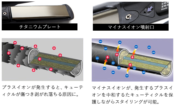 チタニウムプレートとマイナスイオン噴射口のダブルでマイナスイオンを発生。従来にないサラツヤ感に!