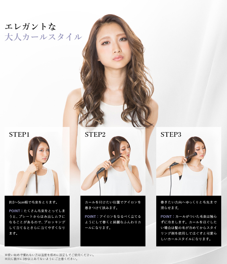 家庭用の低い温度しか設定できないアイロンだとスタイリングのモチが悪いのです。長時間スタイリングを持続させるためには、高い温度が必要になります。