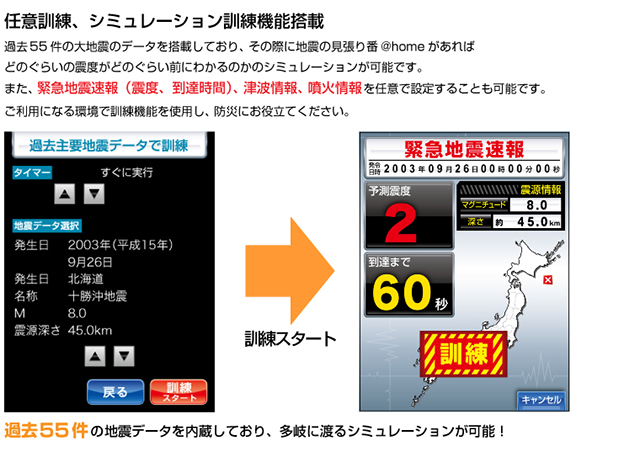 ★ 過去55件の主要地震データを使用したシミュレーション訓練、緊急地震速報(震度、揺れの到達時間)、津波情報、噴火情報を自由に設定できる任意訓練が可能。