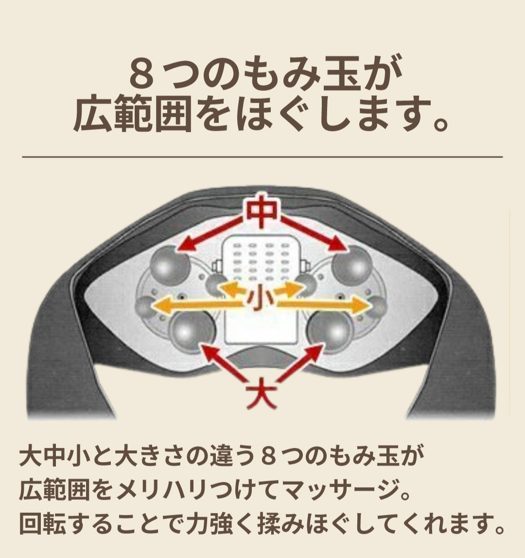 大・中・小3種類、合計8つのもみ玉が、1分ごとに正転・反転を繰り返すことで、複雑で快適な揉み心地を実現します。