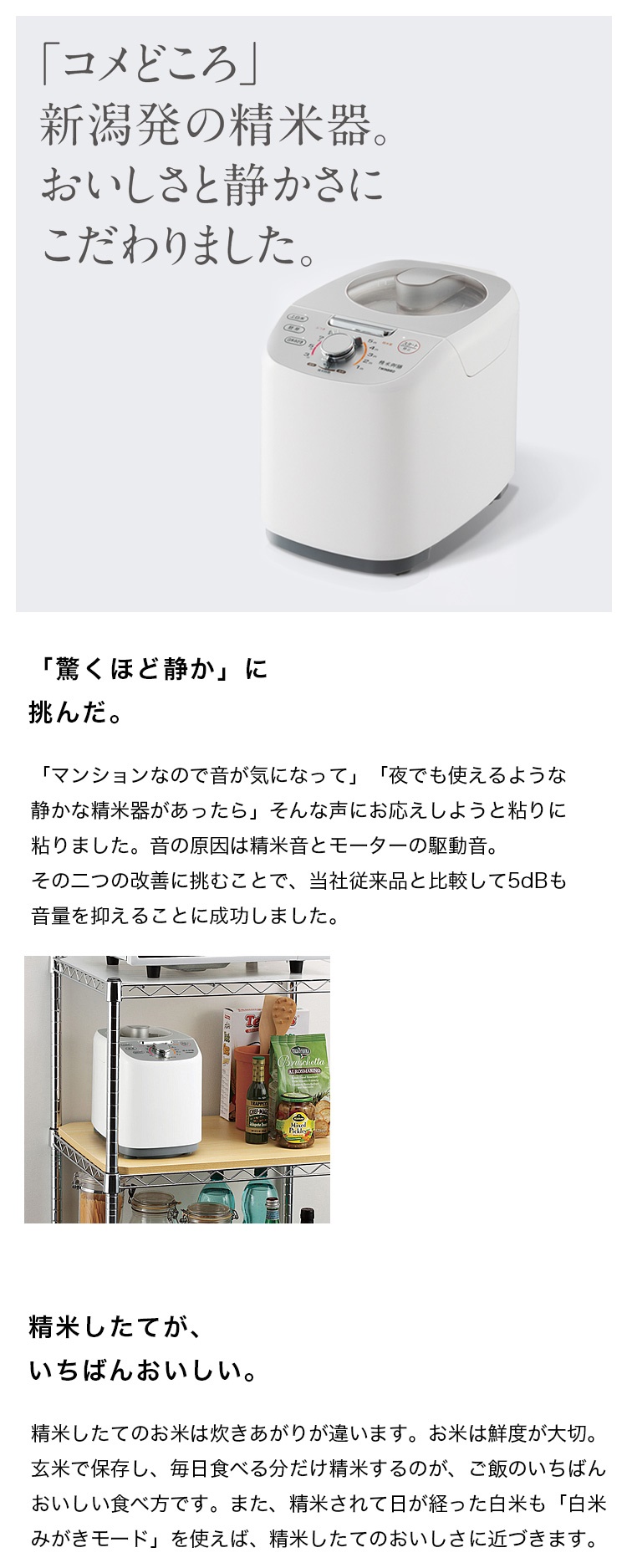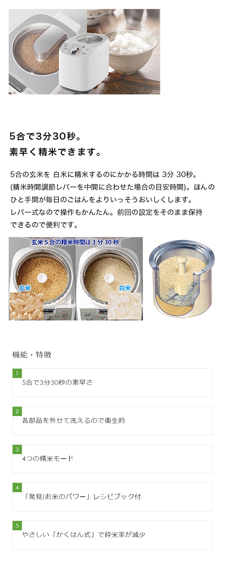 5合の玄米を白米に精米するのにかかる時間は3分30秒です。素早く、美味しく。こだわりの食事は精米から。