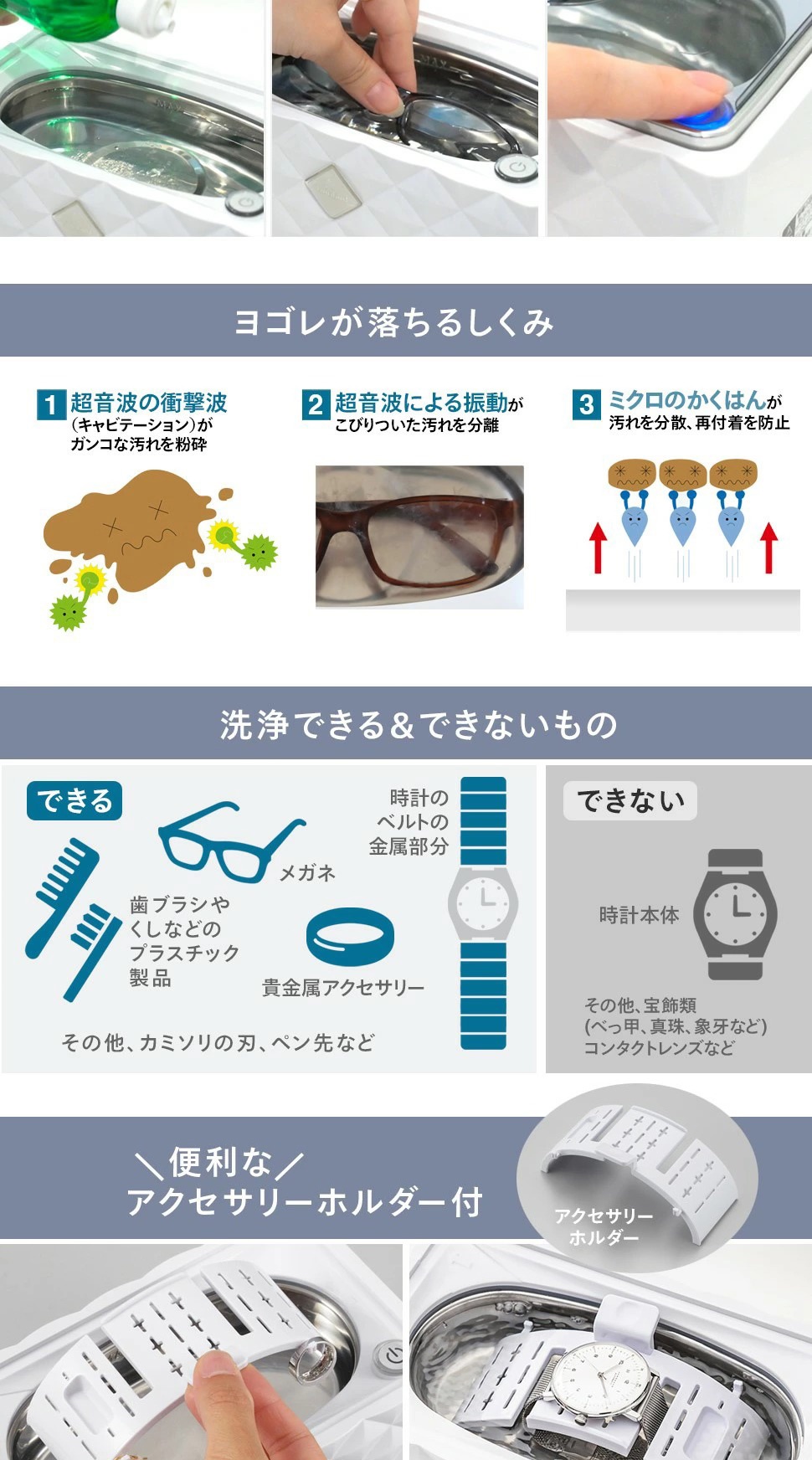 アクセサリーホルダーで、時計のバンドや小さなピアス、ネックレスなどの洗浄もかんたん。アクセサリーホルダーには、つまみがついているので、洗浄後も手を汚さずアクセサリーを引き上げることができます。