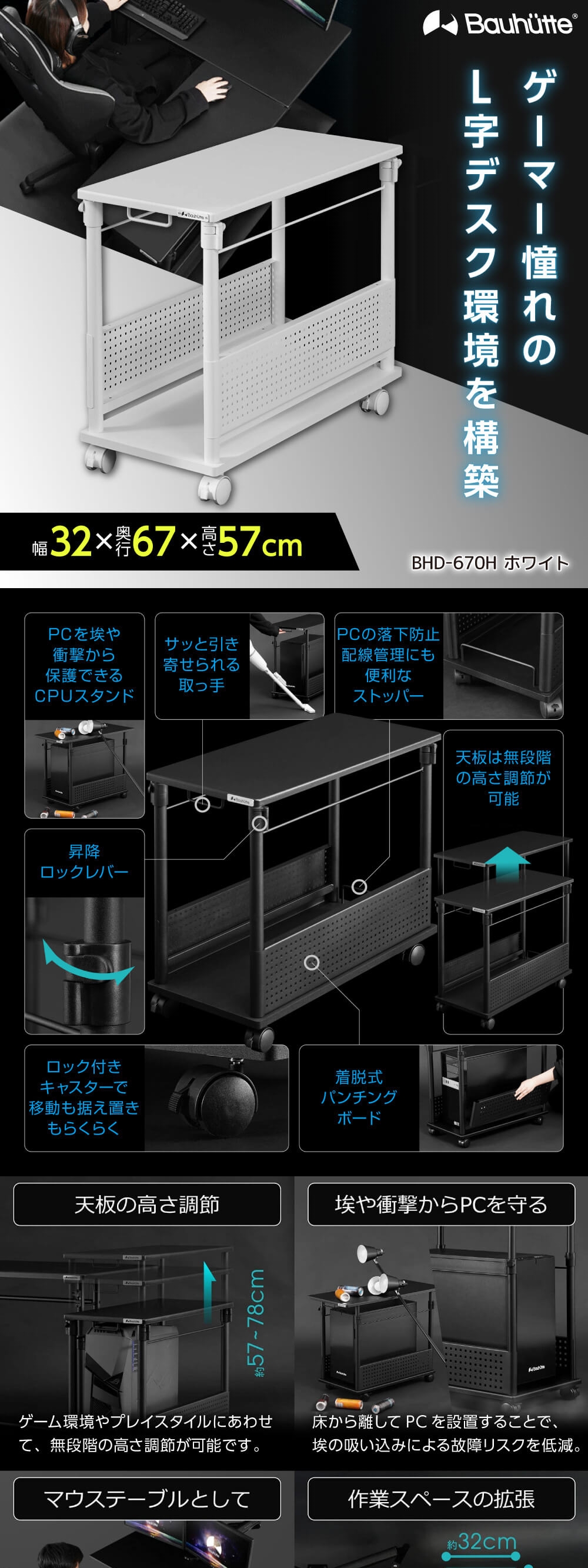 Bauhutte バウヒュッテ BHD-670H-WH 昇降式L字デスク ホワイト ハイタイプ 【日時指定不可】