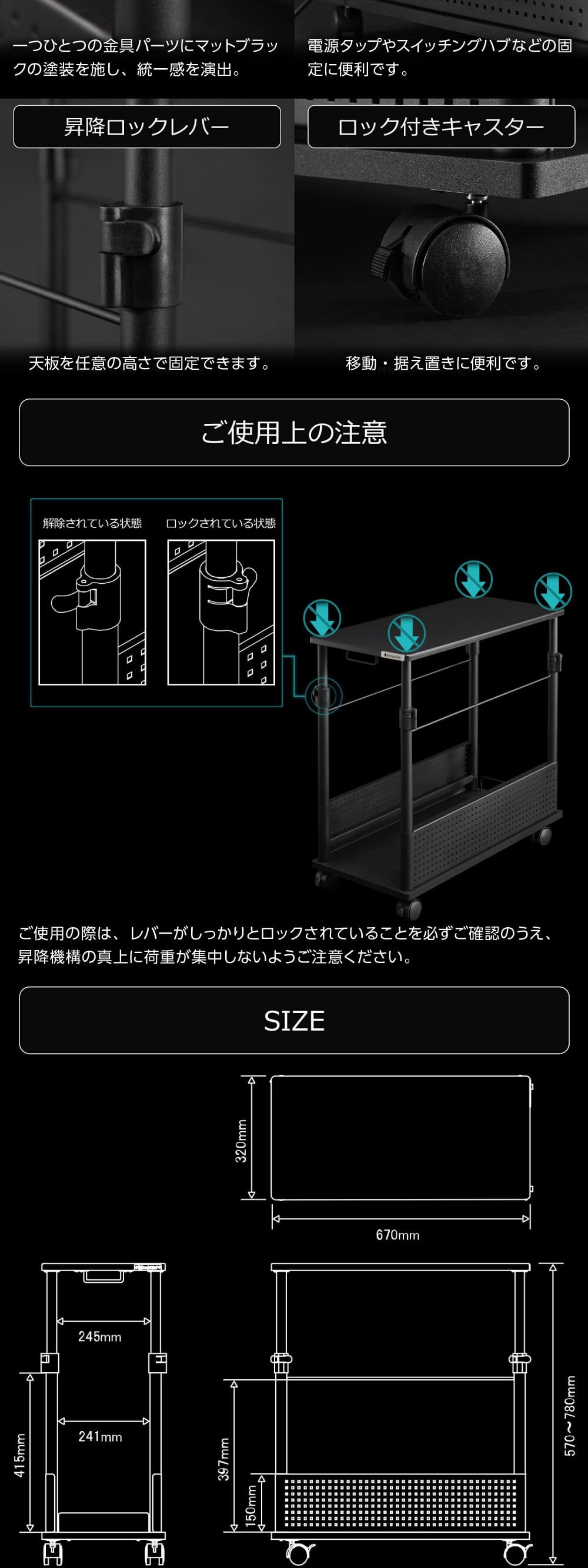 移動、固定に便利なロック付きキャスターを採用。
