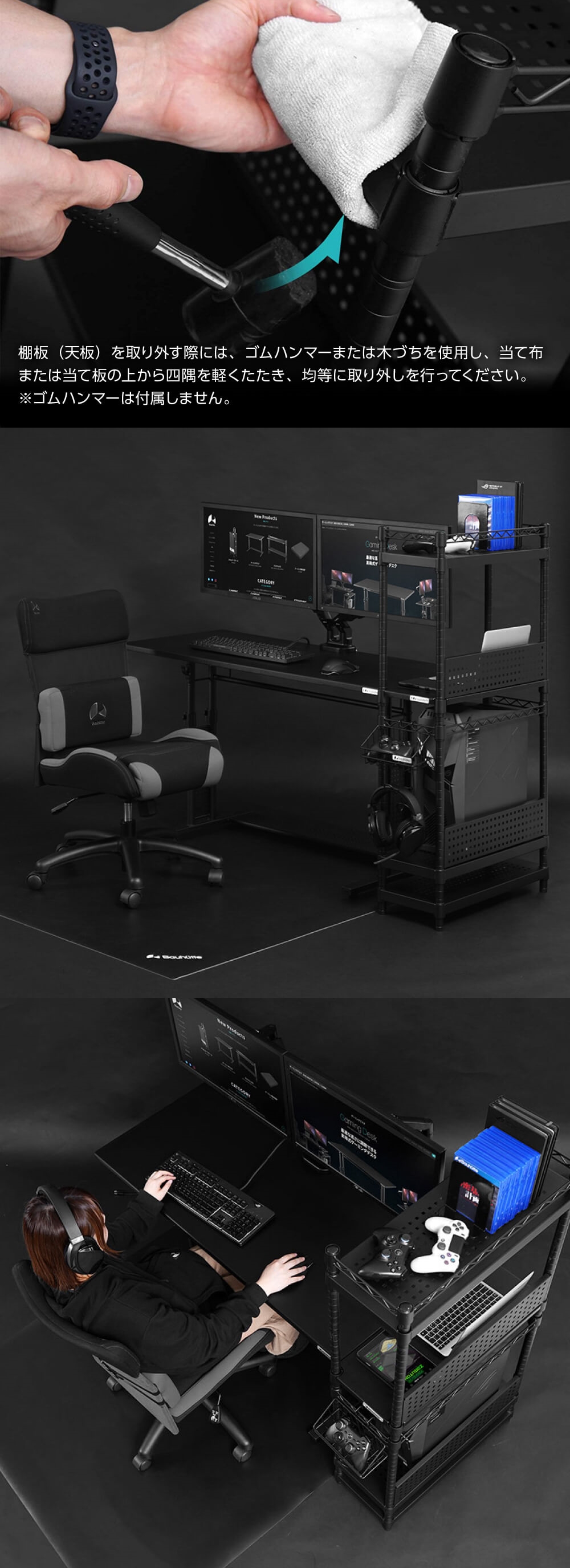 ★ 棚板と背板にはパンチング加工を施してあります。デスク周りのケーブルやデバイスを結束バンドで固定することもできます。
