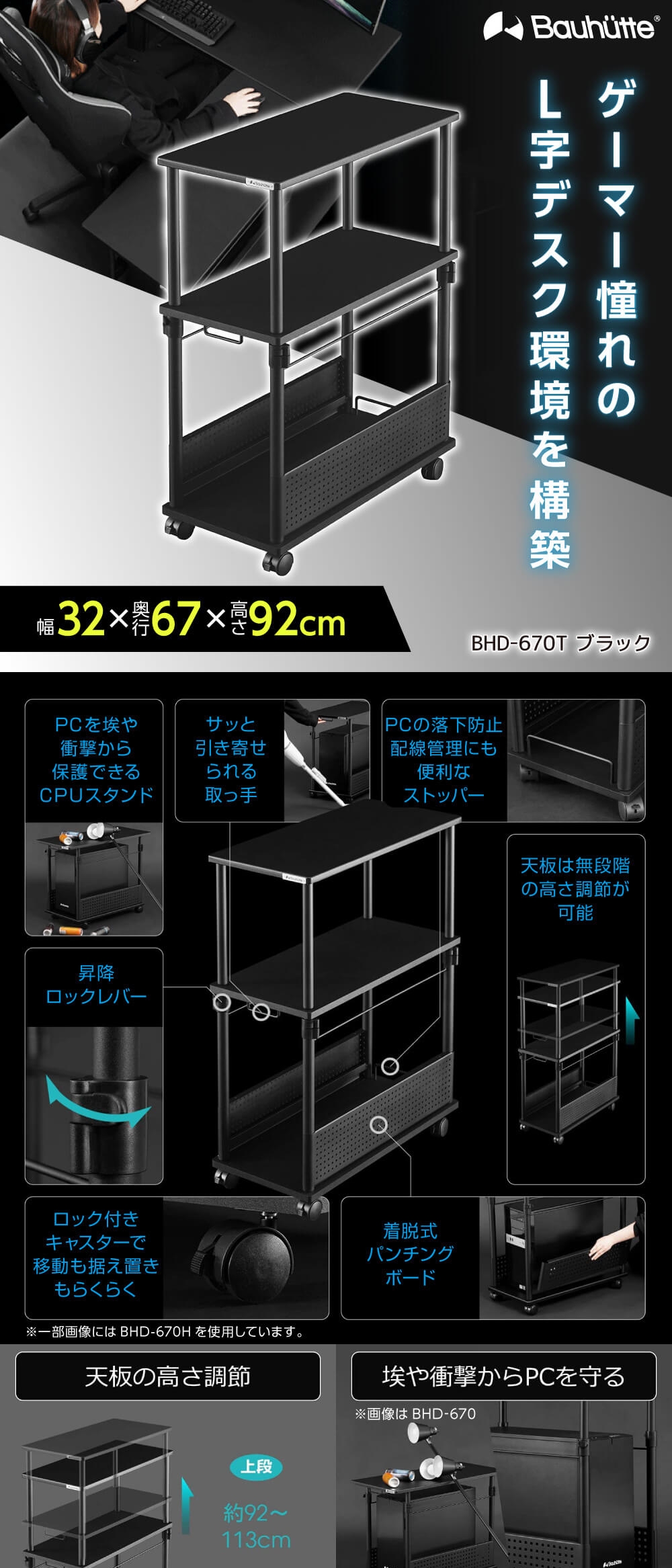 Bauhutte バウヒュッテ BHD-670T-BK 昇降式L字デスク タワータイプ ブラック