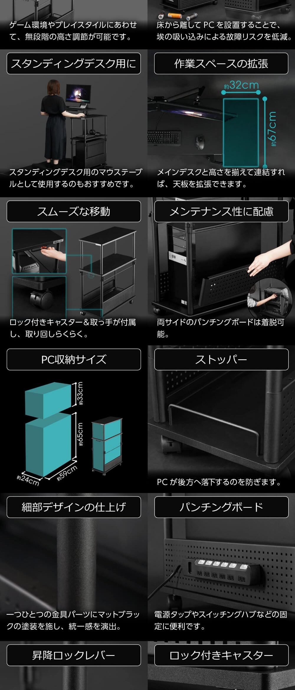 ・床から約8cmほどの高さまでPCを持ち上げることができ、ホコリの吸引率を低減します。