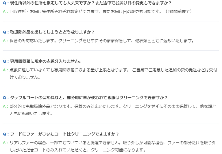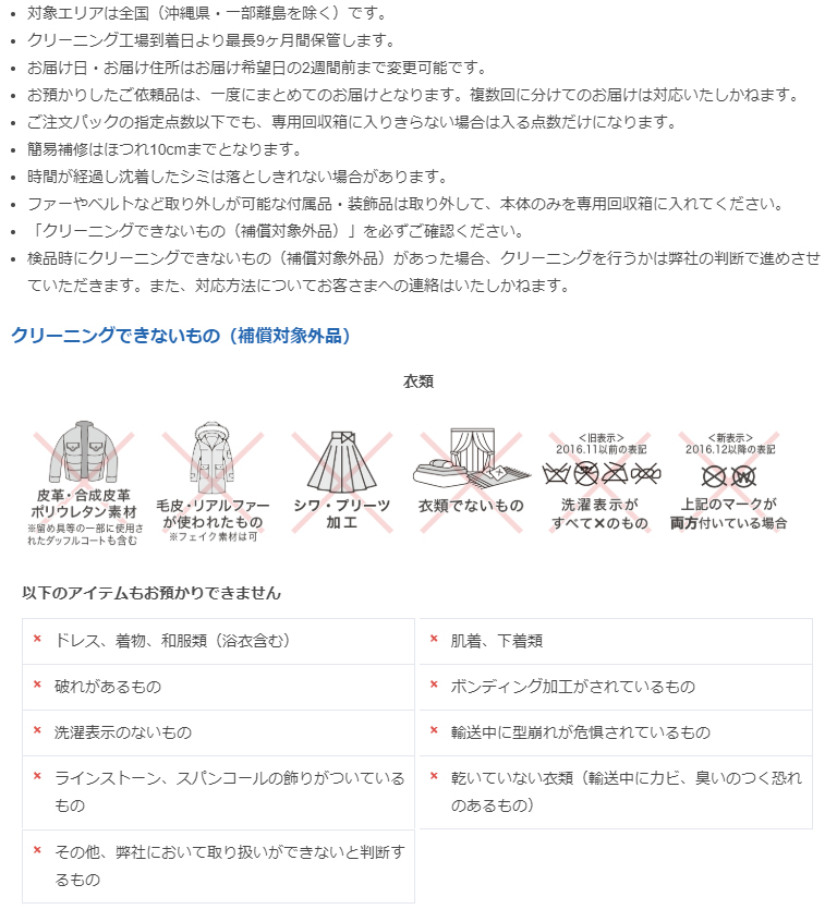 ・「クリーニングできないもの(補償対象外品)」を必ずご確認ください。