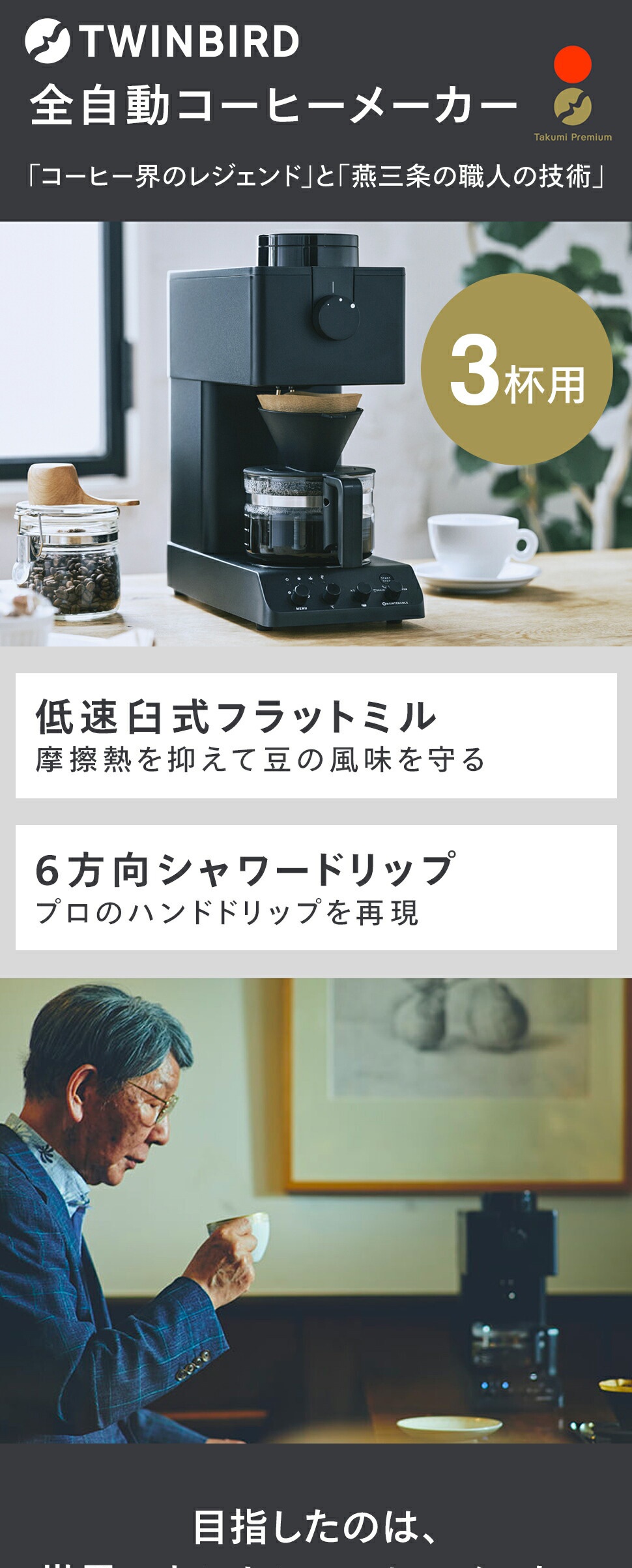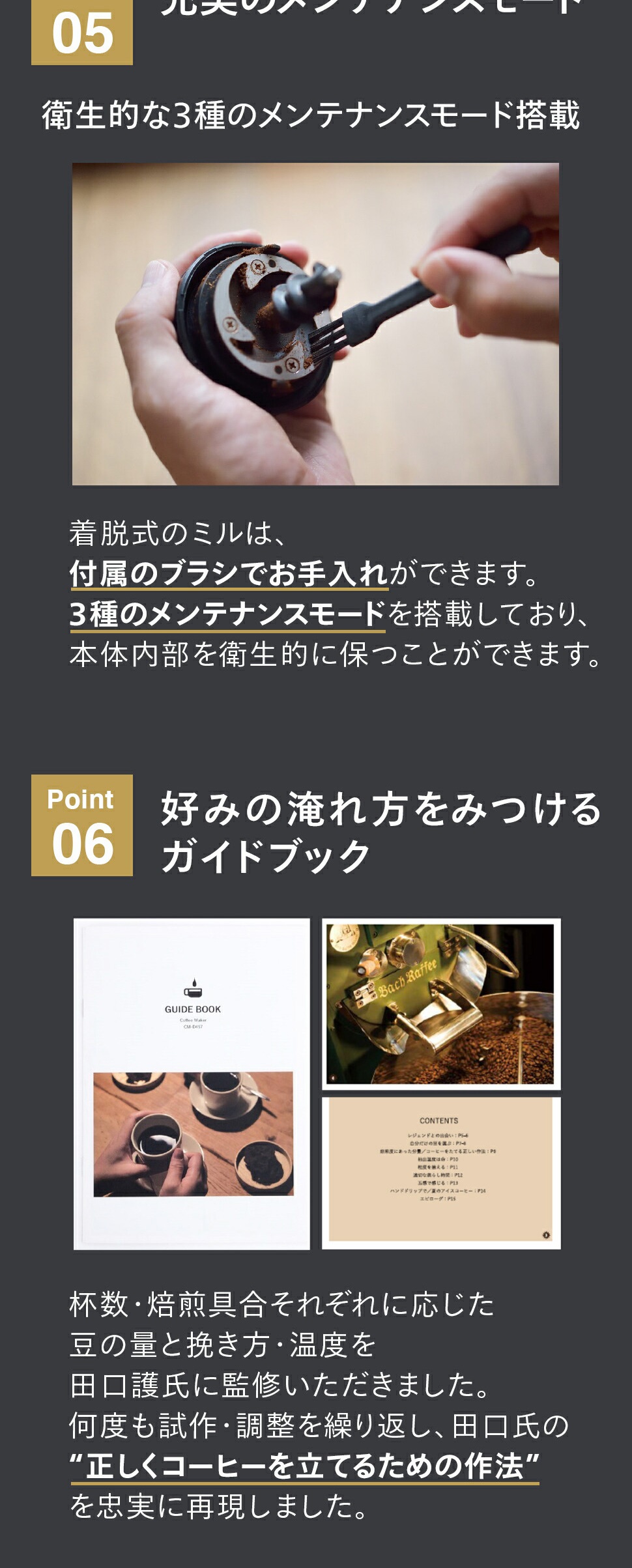 自家焙煎の第一人者としてバリスタも使える本格的な実用書を数多く出版し、コーヒー界のレジェンドとして知られる田口護氏監修のコーヒーメーカーです。