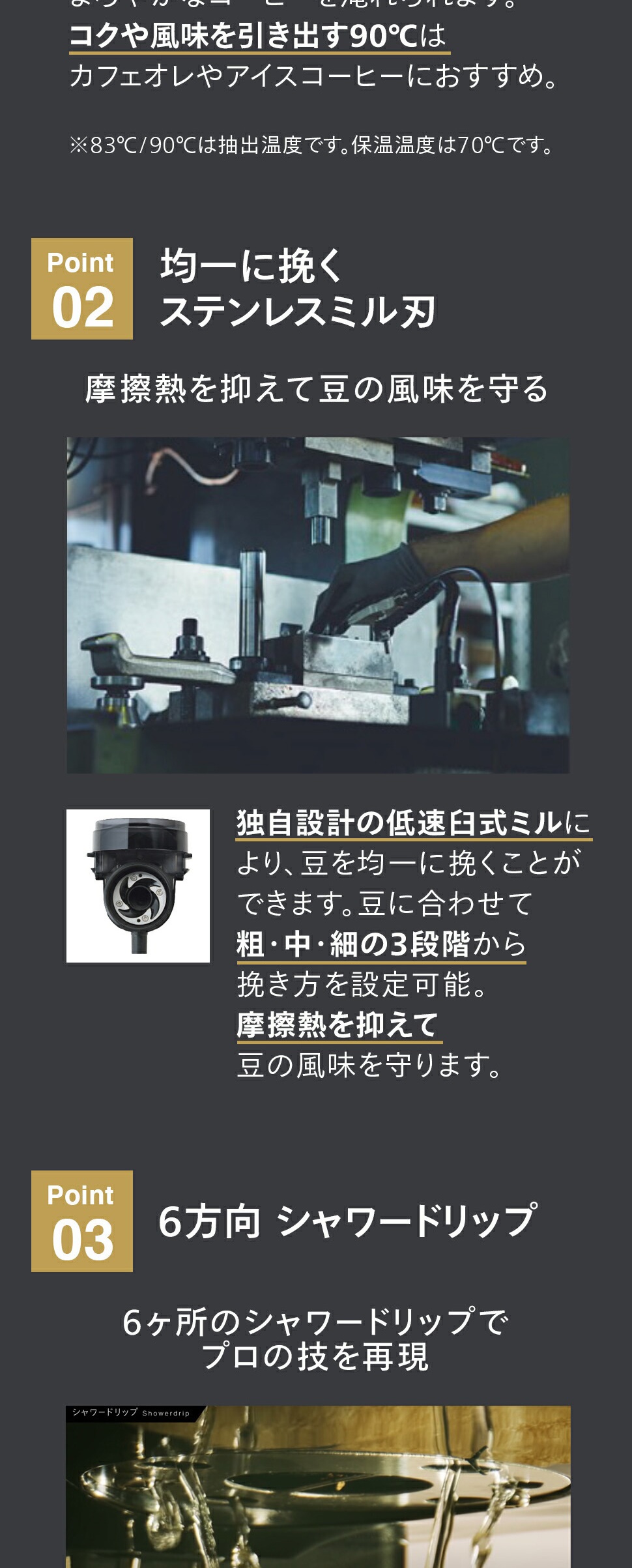 83℃、90℃の抽出温度。こだわりの2段階の湯温調節。
