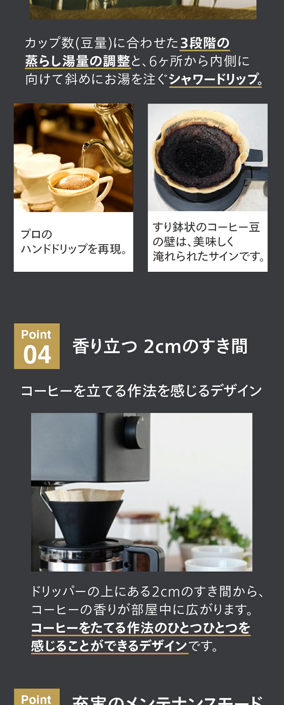 ドリップシャワー噴出口とドリッパーとの間にあえて作った約2cmのすき間は、コーヒーが淹れられる過程を五感で楽しめるようにあえて設けたもの。挽かれた豆が落ちるところから、湯が注がれて膨らむ豆の様子、ドリップの様子などが見えるだけでなく、香り立つコーヒーアロマが部屋中に広がります。