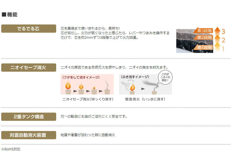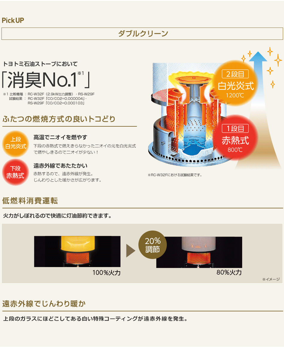 ・上段白光炎式:下段の赤熱式で燃えきらなかったニオイの元を白光炎式で燃やしきるのでニオイが少ない。