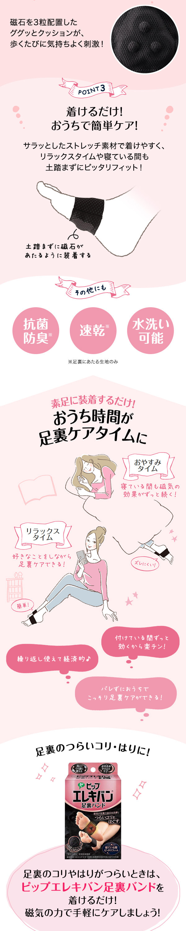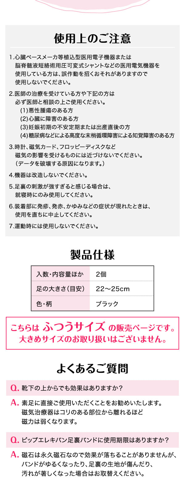 ※ご使用前に:ご使用のたびに、ピップエレキバン足裏バンドに金属片(針やピンなど)が付着していないか確認する。(金属片が付着したまま装着すると、けがをすおそれがあります。)