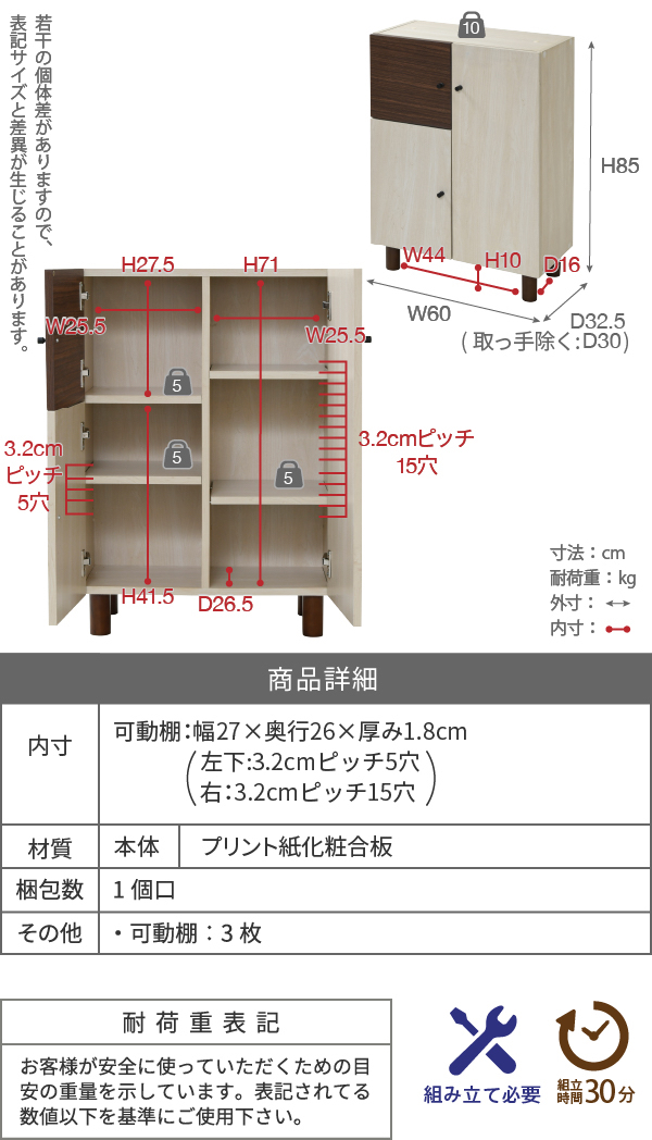 .可動棚: 幅27×奥行26×厚み1.8cm .左下:3.2cmピッチ5穴 .右:3.2cmピッチ15穴