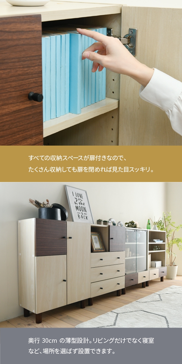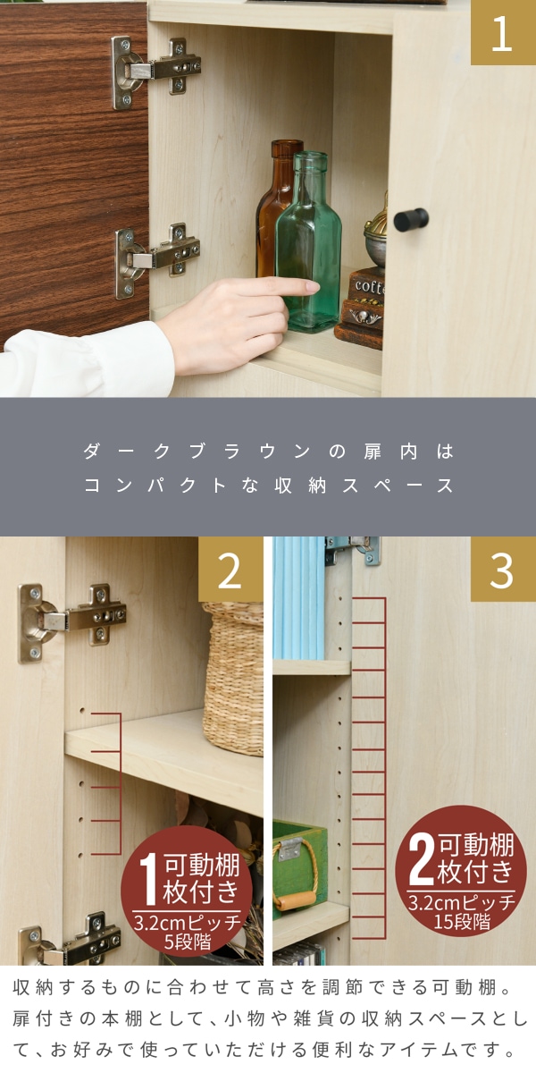 3箇所の収納部はすべて扉付きなのでたくさん収納しても扉を閉めれば見た目スッキリ!ナチュラルカラーの扉内は可動棚になっており、収納物に合わせて高さを調節できます。