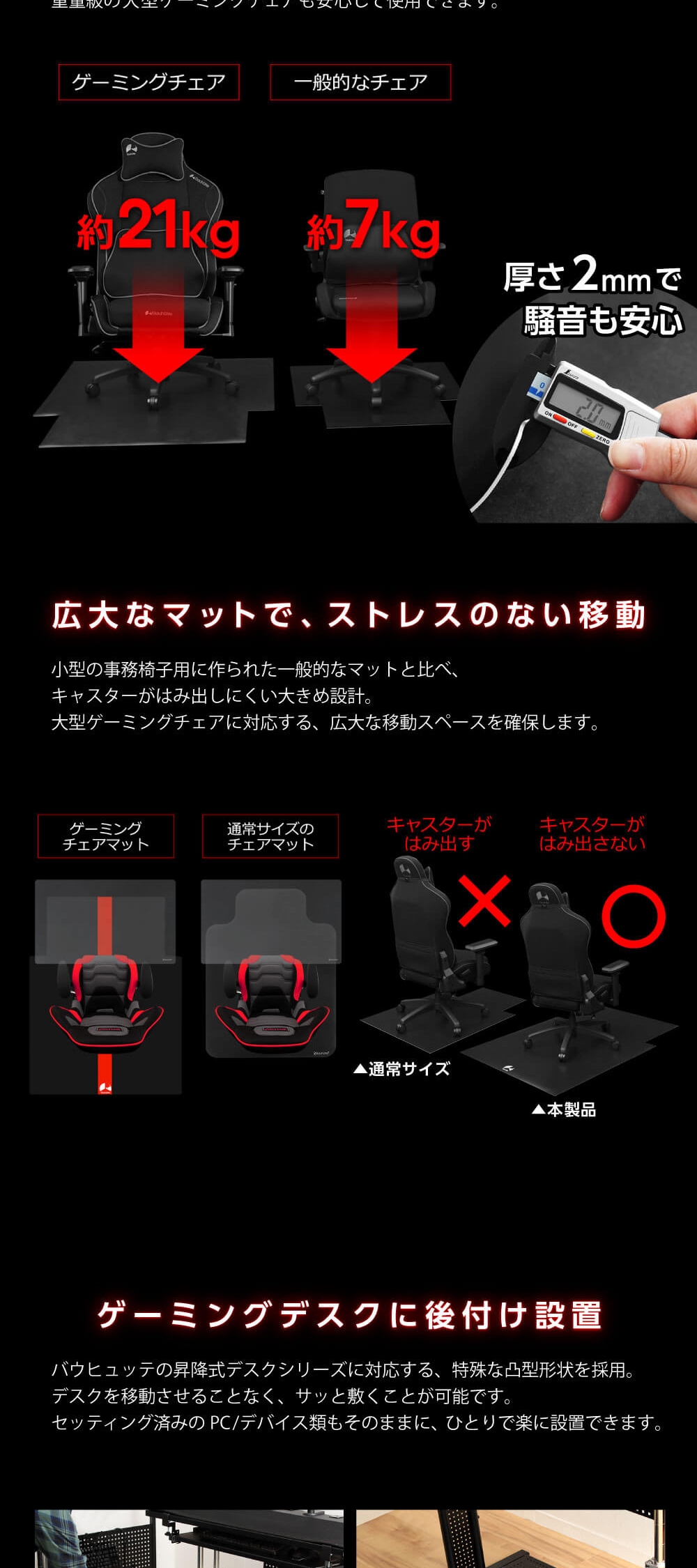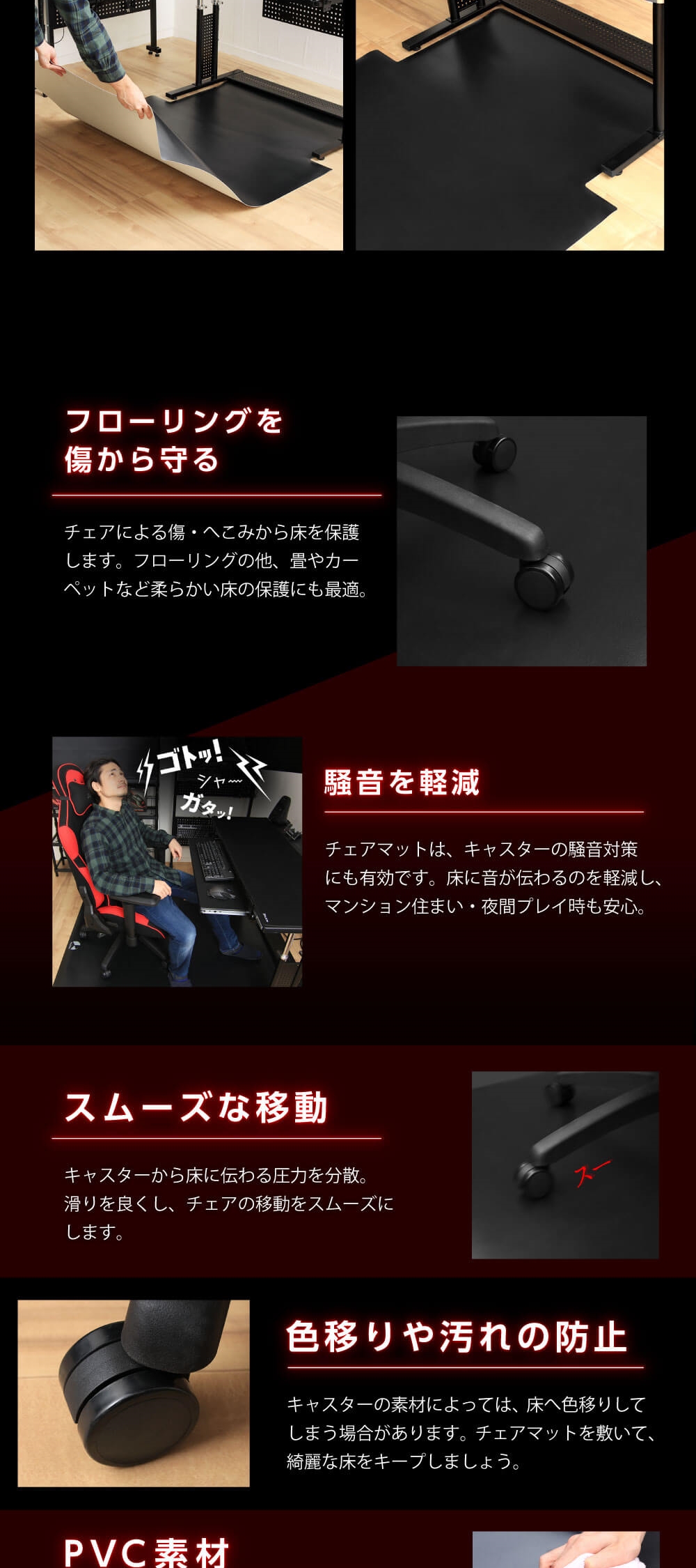 ★ ゲーミングチェアのキャスターによるキズ・へこみから床を保護します。