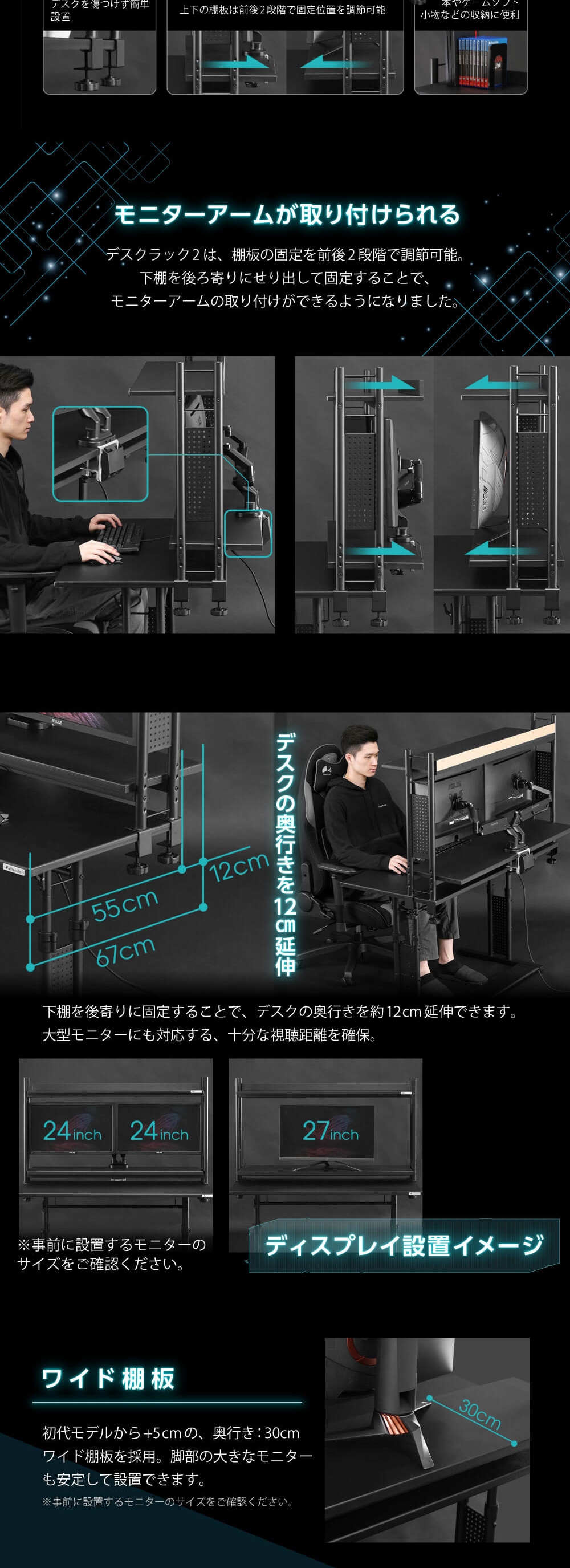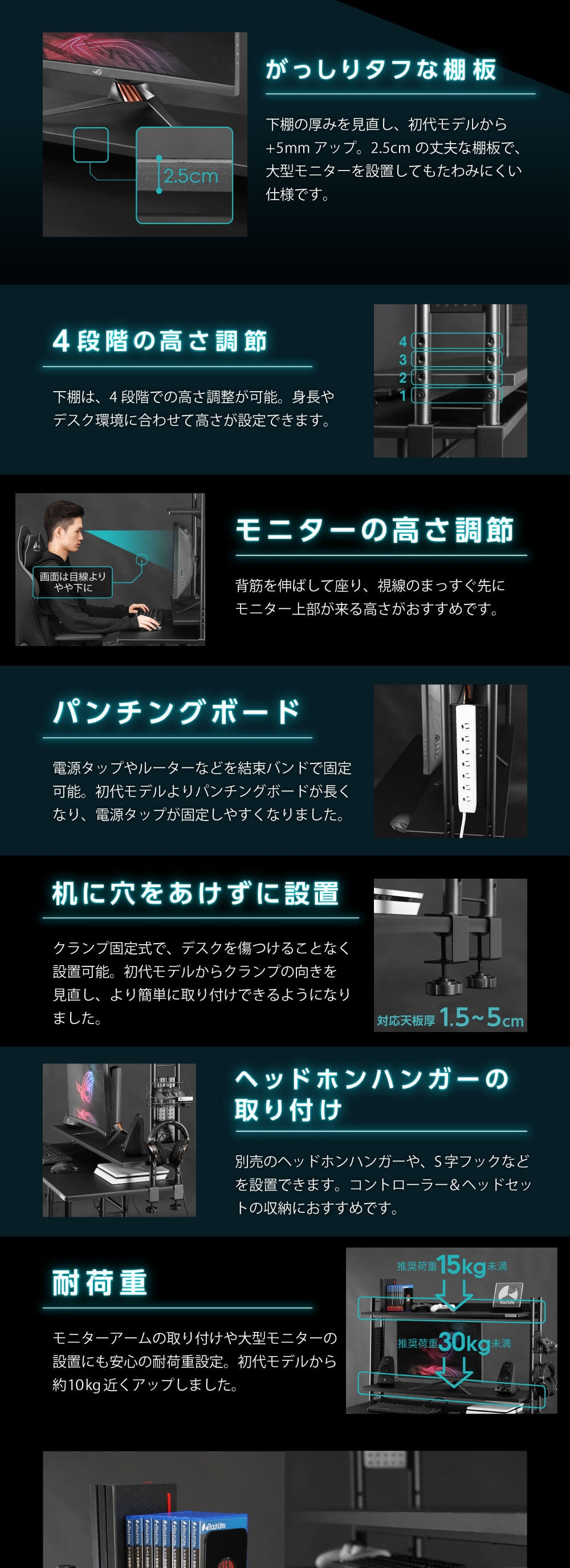 初代モデルから+5cmの、奥行き:30cmワイド棚板を採用。脚部の大きなモニターも安定して設置できます。