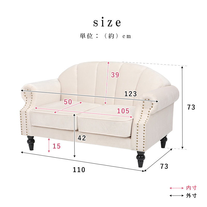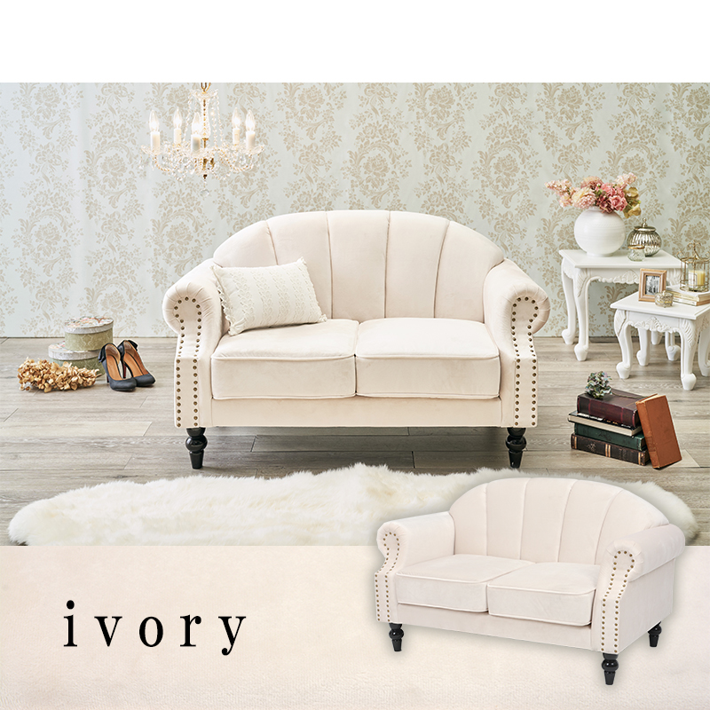 エレガントなデザインの2人掛けソファ。なめらかな生地張りが心地良い。