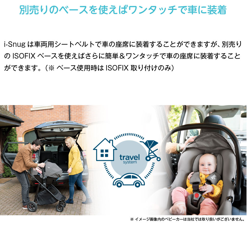 i-Snugは車両用シートベルトで車の座席に装着することができますが、別売りのISOFIXベースを使えばさらに簡単&ワンタッチで車の座席に装着することができます。