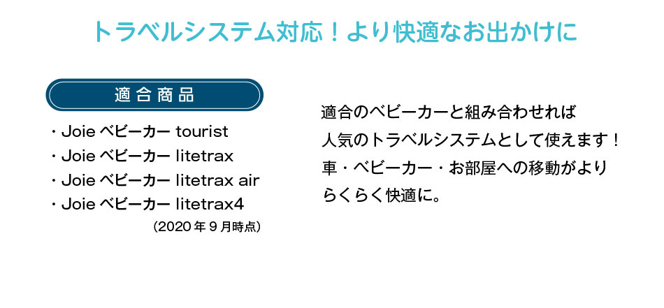適合のベビーカーと組み合わせれば人気のトラベルシステムとして使えます!車・ベビーカー・お部屋への移動がよりらくらく快適に。