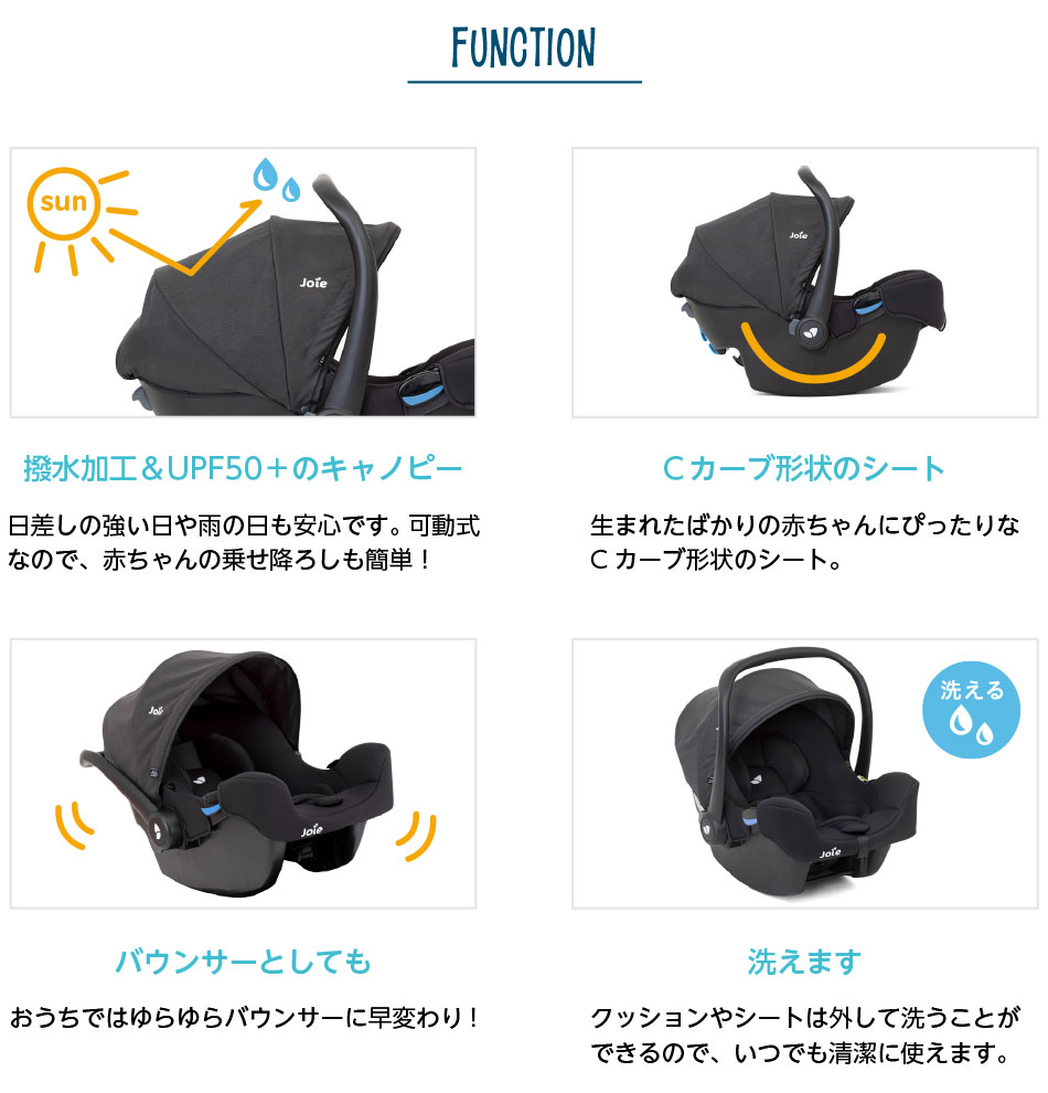 新生児から使えるチャイルドシート、ローチェア、ロッキングチェア、キャリー、トラベルシステムに。1台5役の多機能ベビーシート。