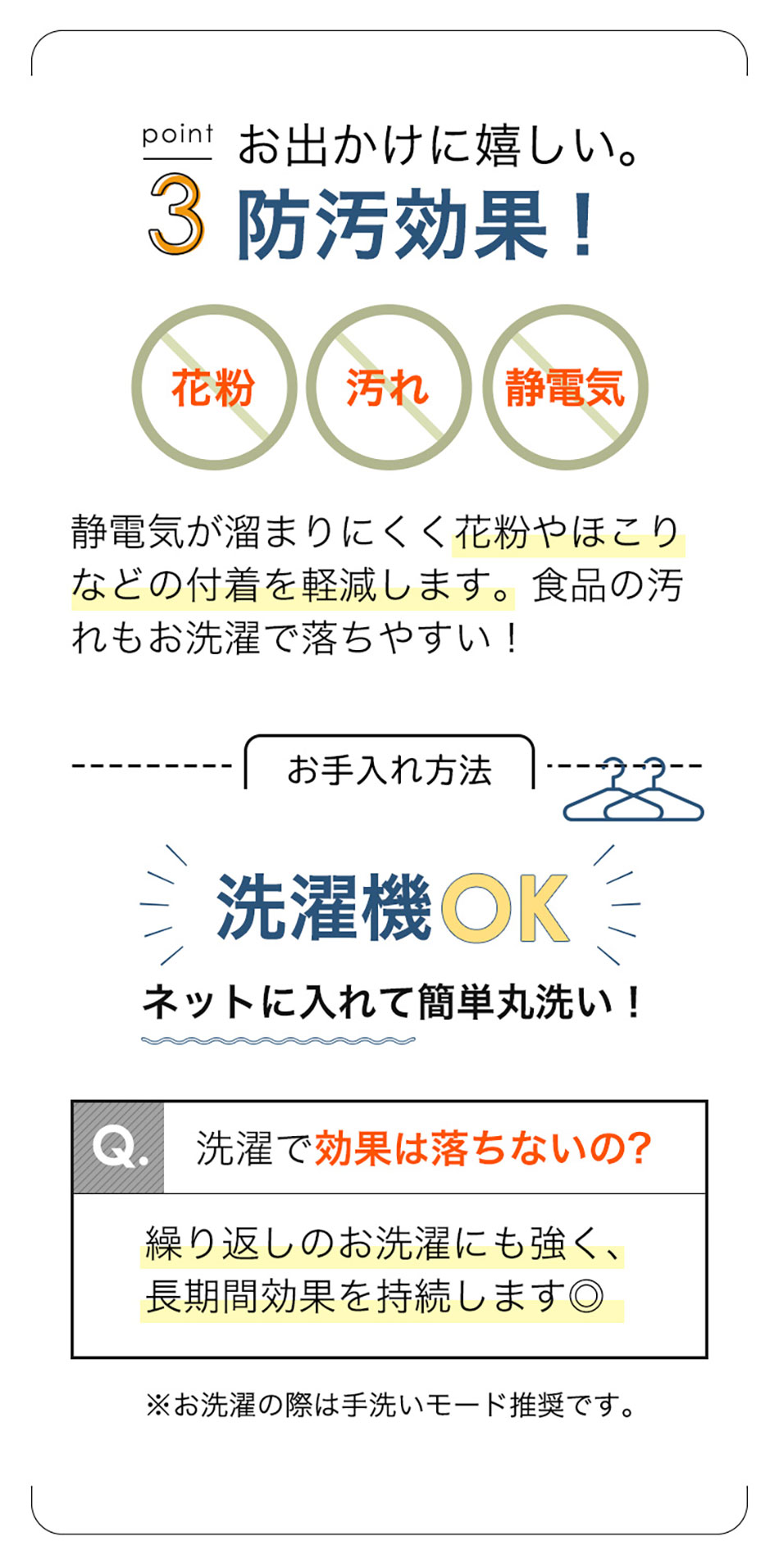 ★ 食品の汚れがお洗濯で落ちやすく、花粉やホコリを手で払うだけで簡単に落とすことが出来る嬉しい効果もあります。