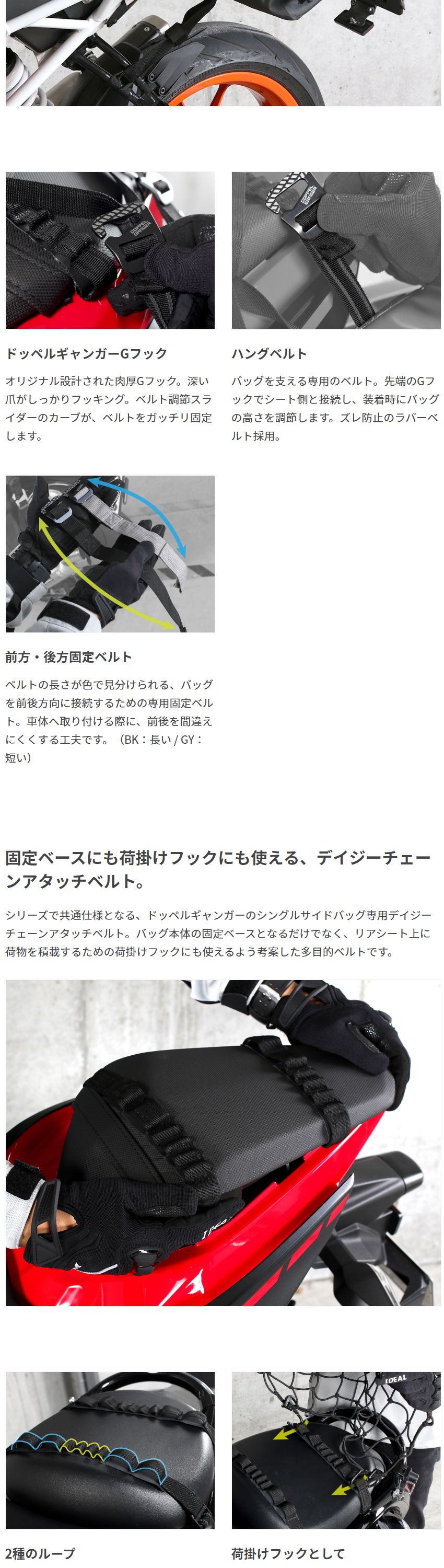 シリーズで共通仕様となる、ドッペルギャンガーのシングルサイドバッグ専用デイジーチェーンアタッチベルト。バッグ本体の固定ベースとなるだけでなく、リアシート上に荷物を積載するための荷掛けフックにも使えるよう考案した多目的ベルトです。
