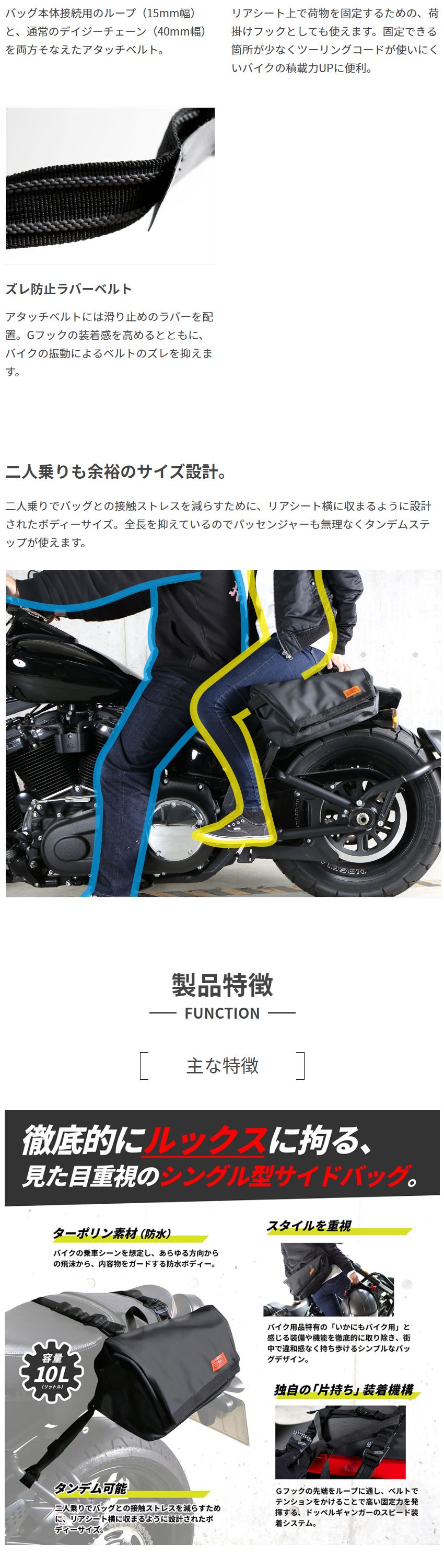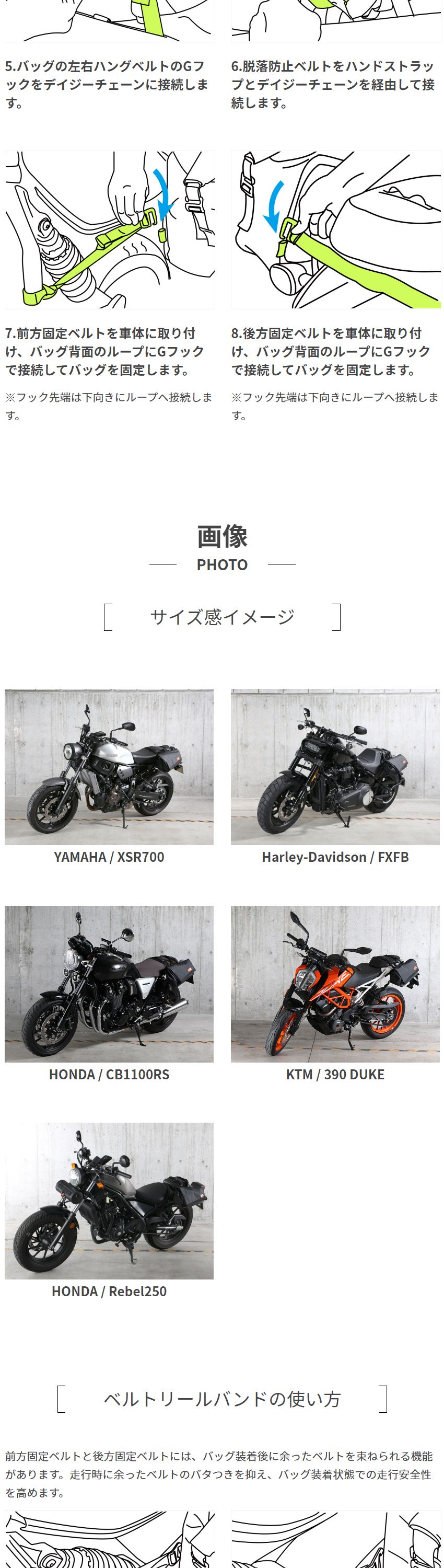 Gフックの先端をループに通し、ベルトでテンションをかけるだけの簡単装着。面倒なサイドバッグの取り付けが飛躍的にスピードアップします。シートx2、車体前方x1、車体後方x1の計4箇所でガッチリ固定する、ドッペルギャンガー独自の装着機構です。