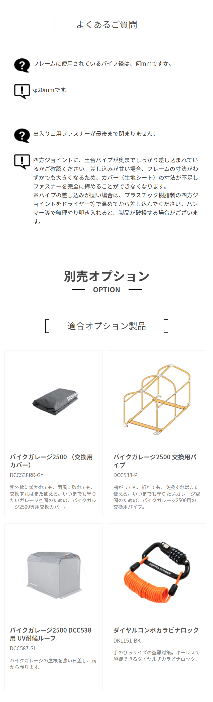 毎日の出動か長期の保管かを問わず、バイクの出し入れのしやすさにこだわったバイクガレージ2500。「かがむ、またぐ、体をねじる」といった、従来の組み立て式ガレージの窮屈さを解消するために進化しました
