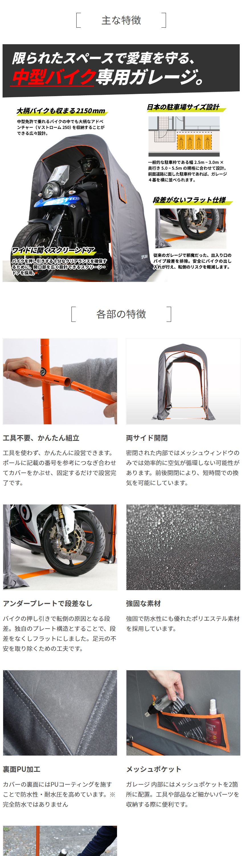 バイクが置ければ、ガレージは置ける。少ないスペースを活用できる、ちょっとスリムな中型バイク専用ガレージ。