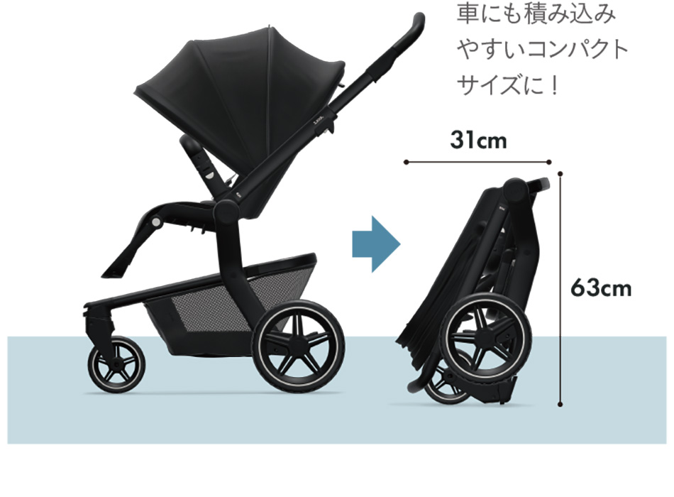 ・シートが前向き・後ろ向きのどちらの状態でも折り畳め、車のトランクにも簡単に収納可能です。