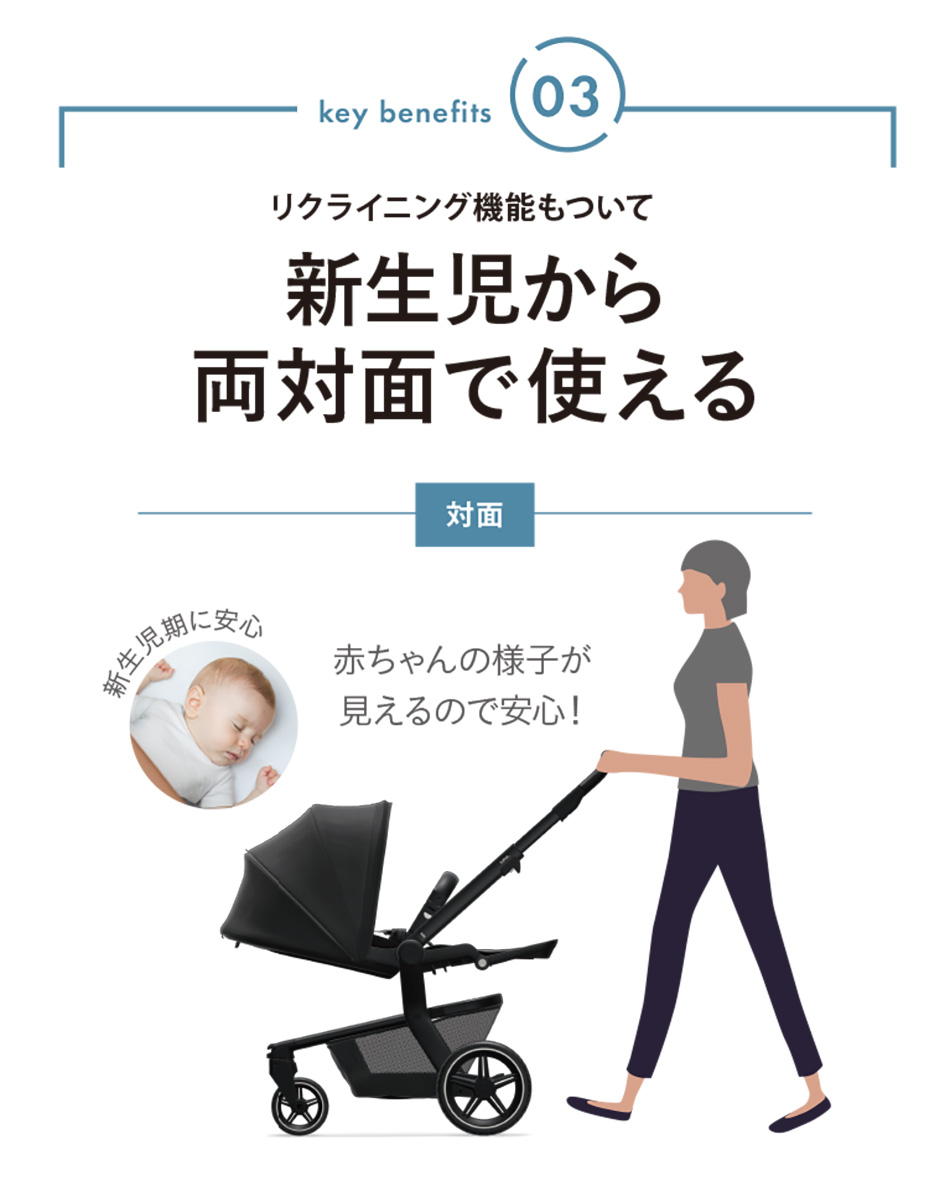 ★ 段差や凸凹道もスムーズに走行できるサスペンション付き大口径タイヤと、クッション性の高い対面式リクライニングのシートで赤ちゃんの快適性を追求しながらも、駅改札を通り抜けできるスリム幅、ショルダーストラップで持ち運び可能な折り畳み機能など、パパママの利便性も十分に考えられたベビーカーです。