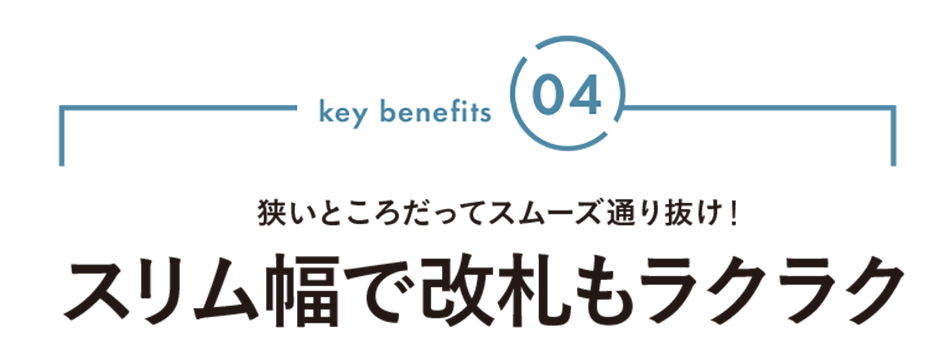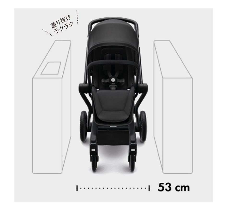 ・大きなタイヤ(前輪15.5cm、後輪25.5cm)で押しやすく、進行方向前側の車幅の方が狭いから、小回りが効いて片手でもスムーズに操作できます。