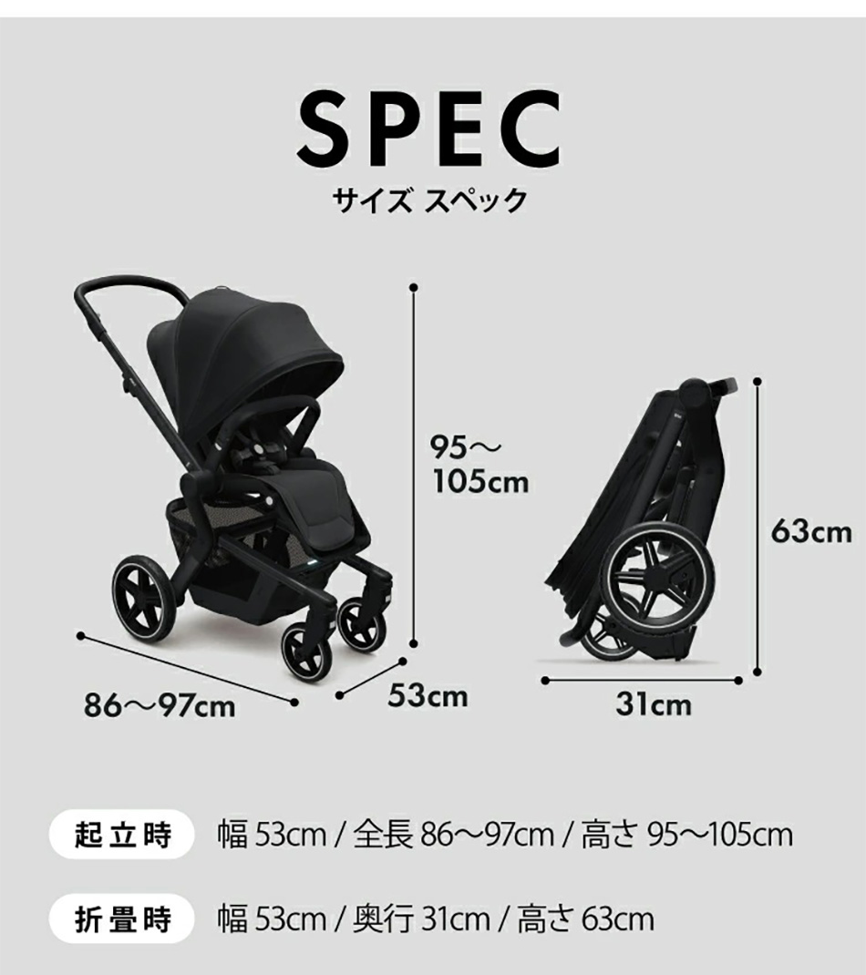・サイズ:幅53×全長86~97×高さ95~105cm、折り畳み時:幅53×奥行31×高さ63cm、重量:11kg