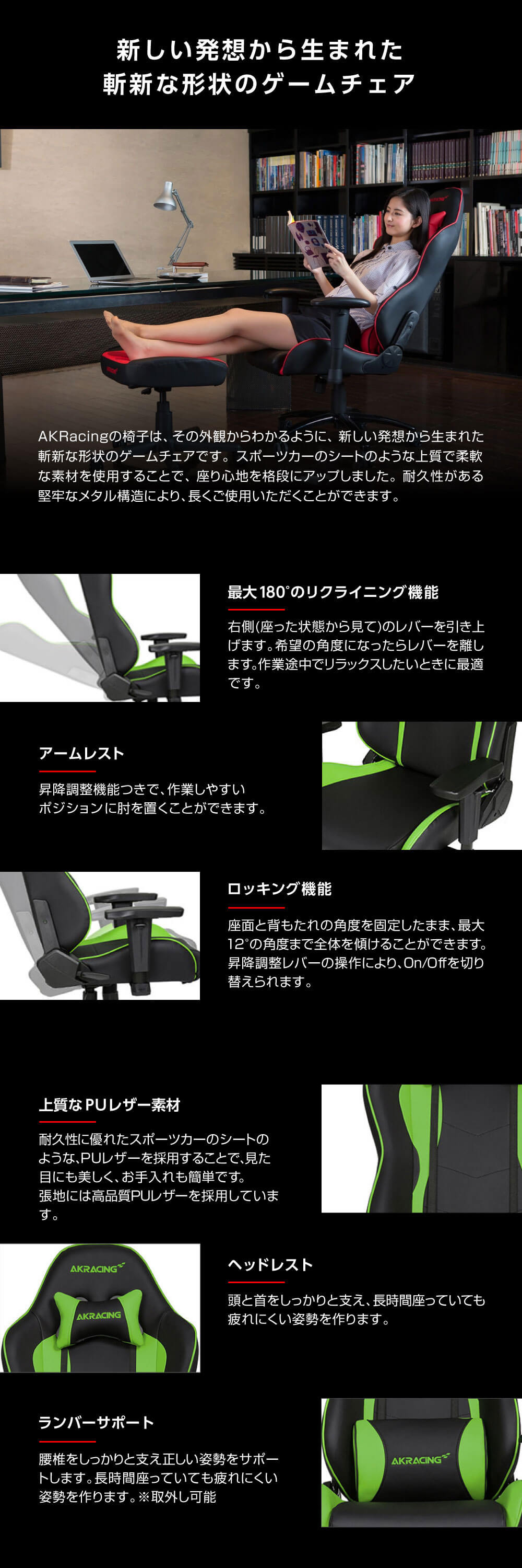 AKRacingの椅子は、その外観からわかるように、新しい発想から生まれた斬新な形状のゲームチェアです。スポーツカーのシートのような上質で柔軟な素材を使用することで、座り心地を格段にアップしました。耐久性がある堅牢なメタル構造により、長くご使用いただくことができます。
