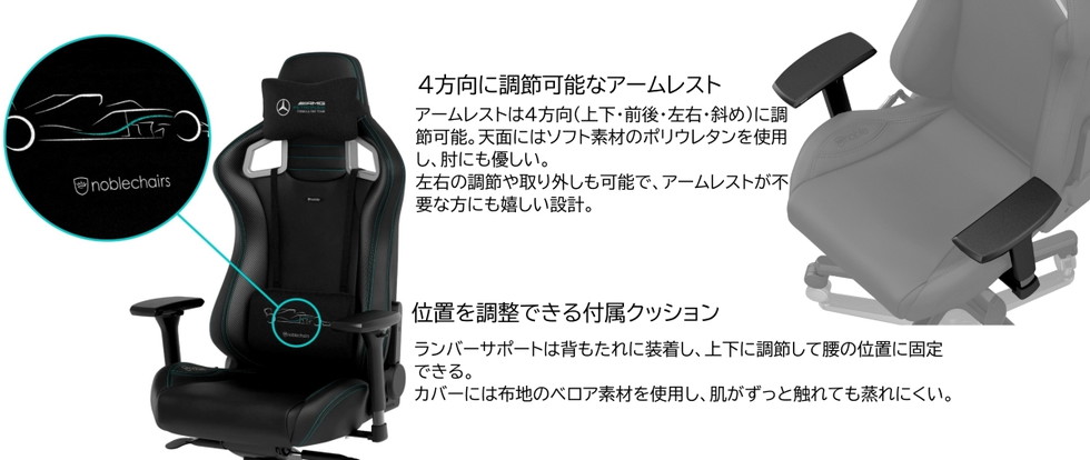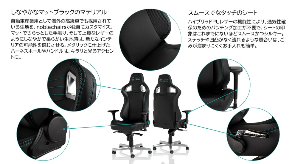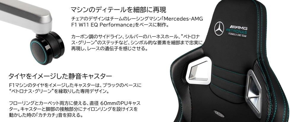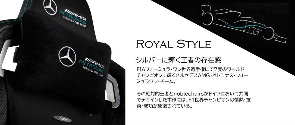 ・メルセデスAMG・ペトロナス・フォーミュラワン・チームとの密接な協力によりデザインされた、noblechairs限定のオフィシャルライセンス取得製品。
