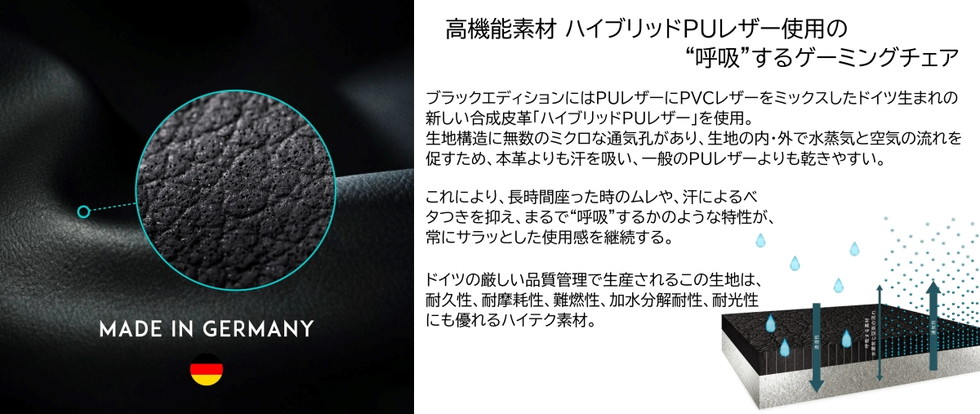 張り地にはnoblechairs のハイグレードシリーズBLACK EDITIONで使用されている、ドイツ生まれの新しい合成皮革「ハイブリッドPUレザー」を使用。本革よりも汗を吸い、一般のPUレザーよりも乾きやすい。まるで「呼吸」するかのような特性が、常にサラッと快適な座り心地を保つ。