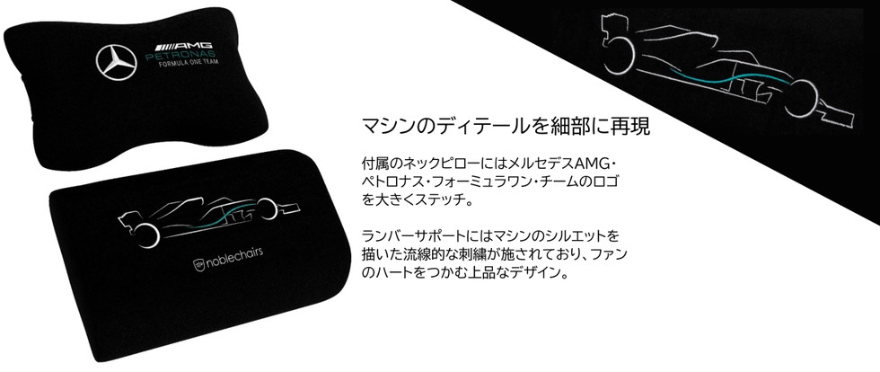 付属のネックピローにはメルセデスAMG・ペトロナス・フォーミュラワン・チームのロゴを大きくステッチ。ランバーサポートにはマシンのシルエットを描いた流線的な刺繍が施されており、ファンのハートをつかむ上品なデザイン。