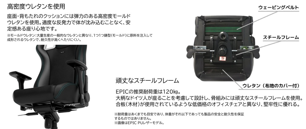 EPICの推奨耐荷重は120kg。大柄なドイツ人が座ることを考慮して設計し、骨組みには頑丈なスチールフレームを使用。合板(木材)が使用されているような低価格のオフィスチェアと異なり、堅牢性に優れる。