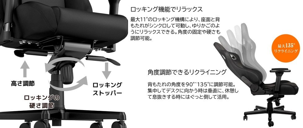 最大11°のロッキング機構により、座面と背もたれがシンクロして可動し、ゆりかごのようにリラックスできる。ロッキングストッパーにより好きな角度で固定、またアジャスターを回して硬さも調節可能。