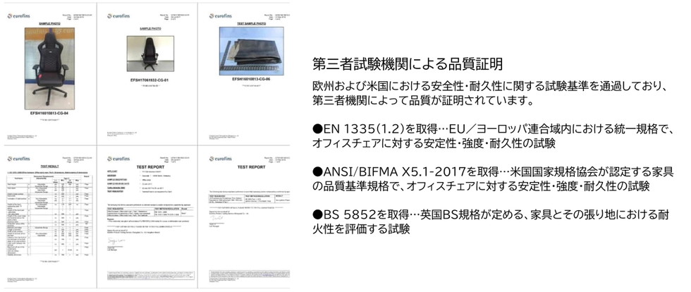 noblechairsは、全シリーズが欧州における安全性・耐久性に関する検査基準を通過しており、第三者機関によって品質が証明されています。
