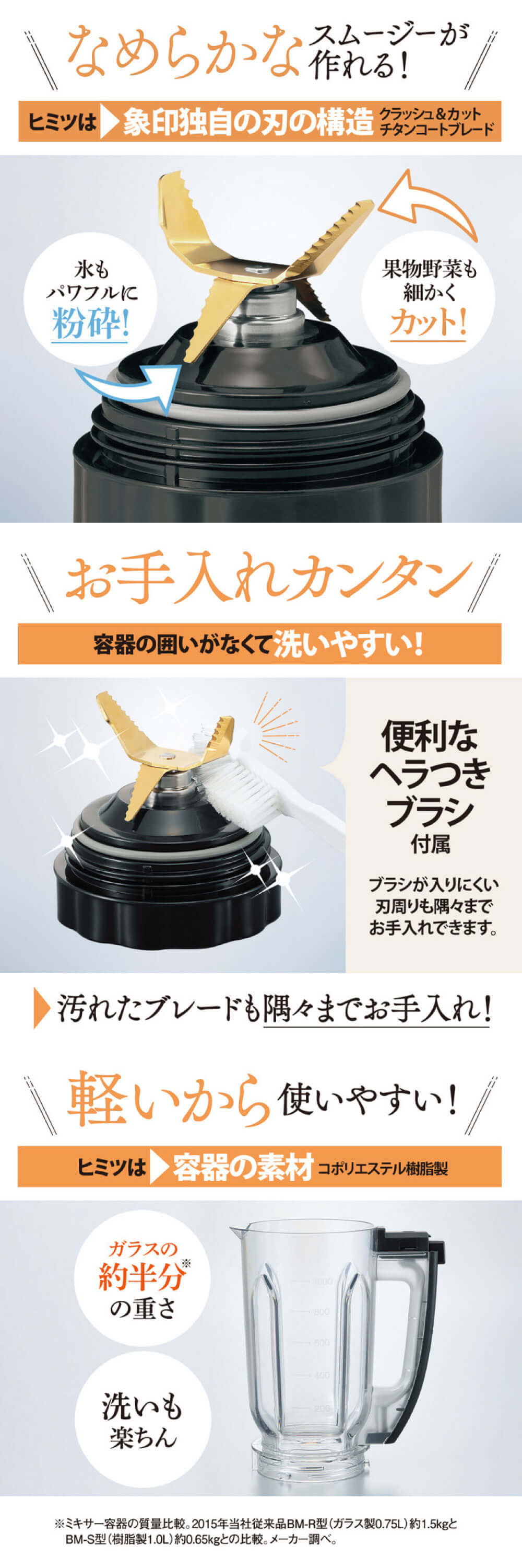 1Lの大容量容器でスムージーをたっぷり作れます。強度、透明性に優れた高機能素材「コポリエステル樹脂」を採用。