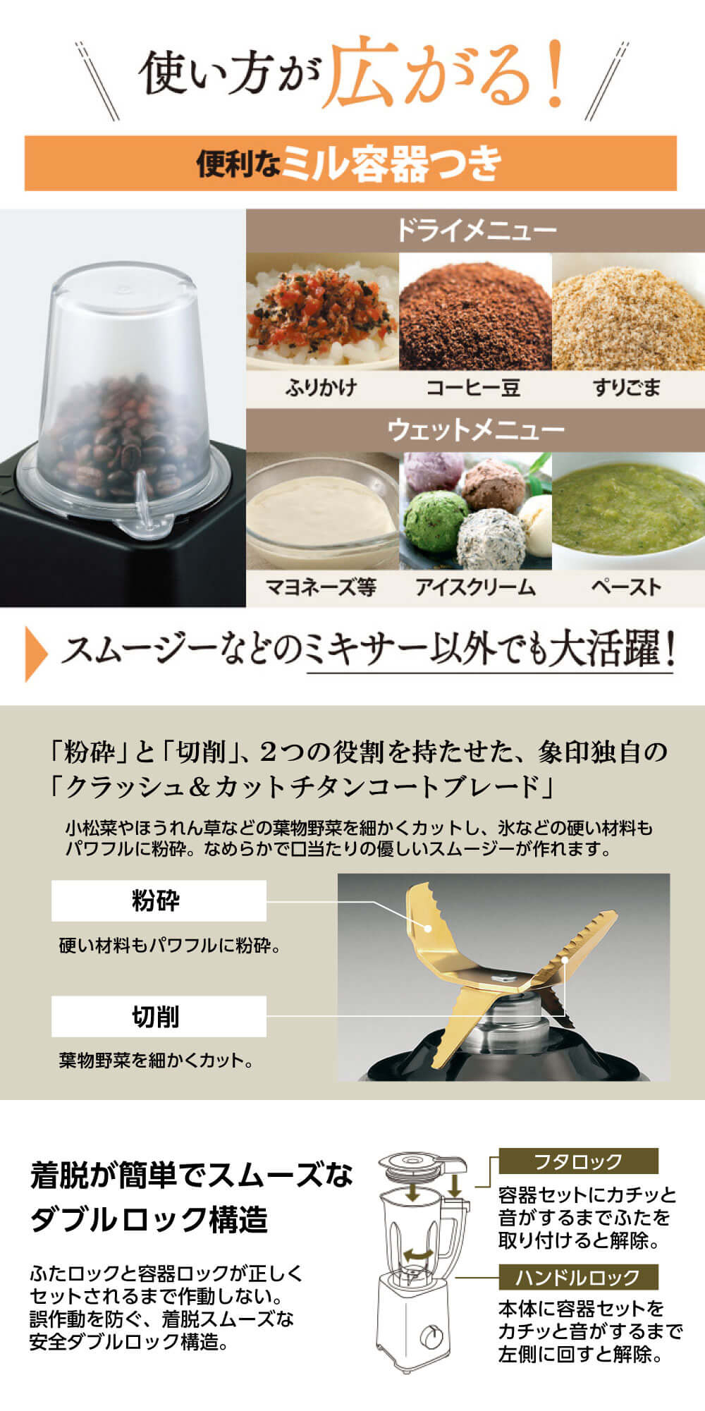 コーヒー豆のミルにも対応。ふりかけ、ドレッシング、ソースなど多様な使い方も可能。