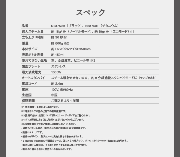 | スチーム量 | 最大約18g/分(ノーマルモード)、約10g/分(エコモード) |