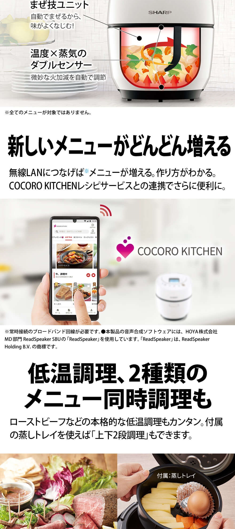 付属の蒸しトレイを使えば、「上下2段調理」で2種類のメニューを同時に調理できます。