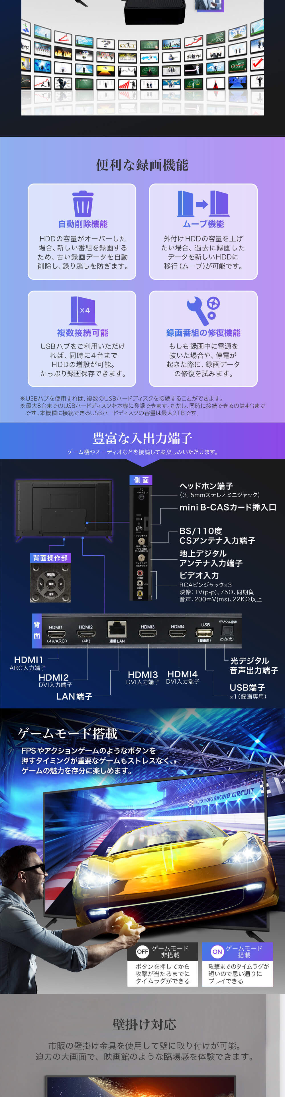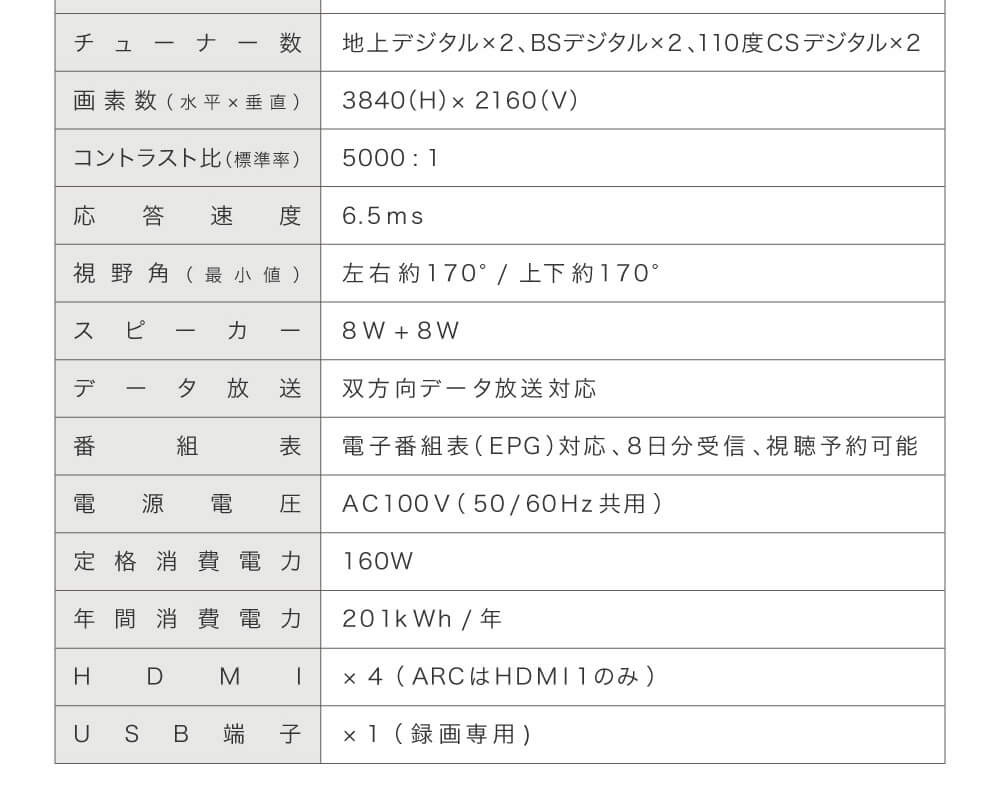 * 付属品:リモコン×1個、リモコン用単4乾電池×2本、miniB-CASカード×1枚、取扱説明書(保証書付き)×1部、電源ケーブル×1本、スタンド取扱説明書×1部