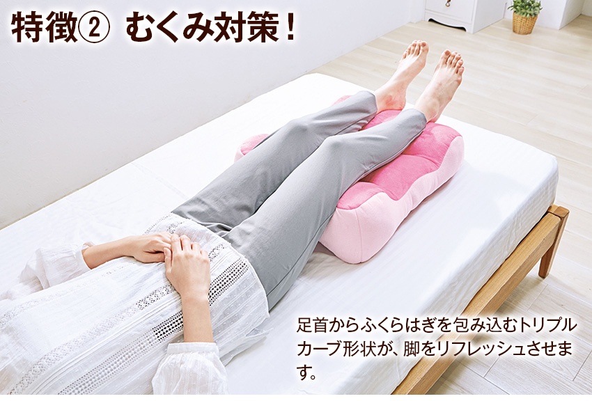 適度な高さと脚のカーブに沿った形状が足首からふくらはぎを包み込むように支え、脚全体にリラックス効果を与えます。