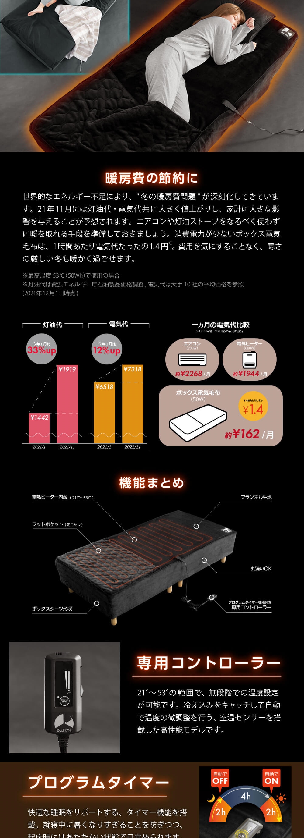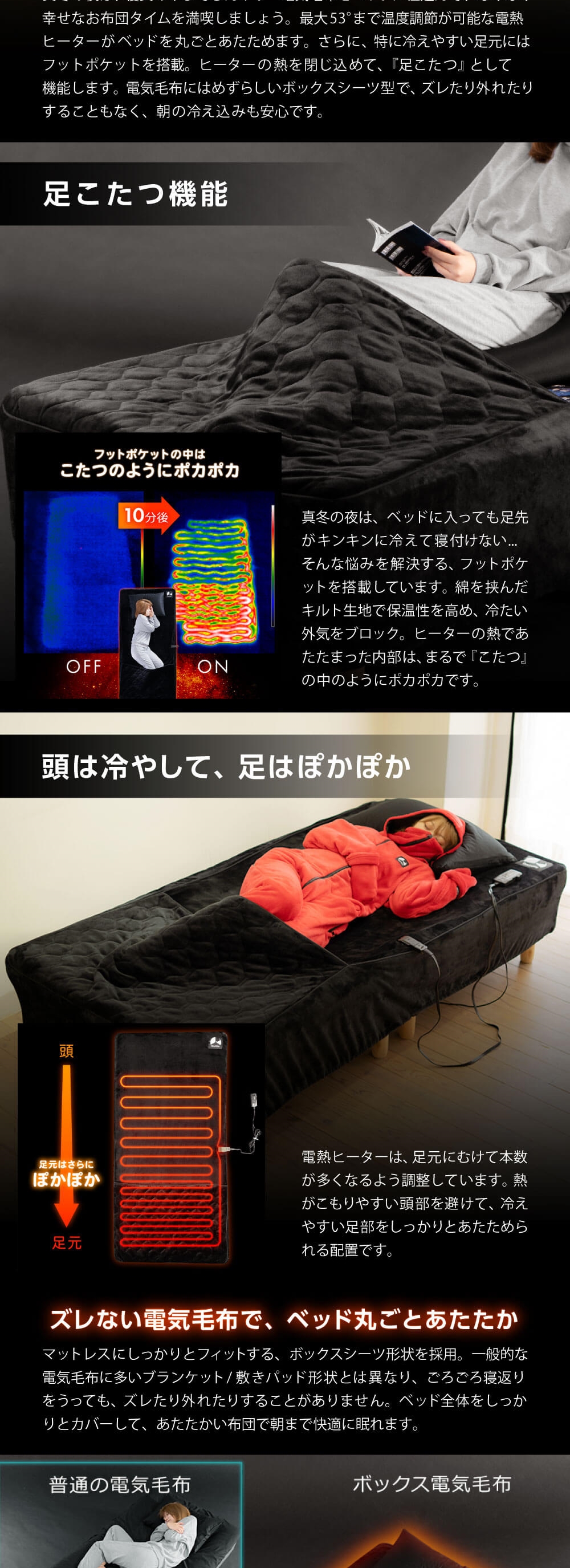 ベッドを丸ごとあたためる、ボックスシーツ型の電気敷毛布です。フットポケット付きで、冷えやすい足元までしっかりカバーします。
