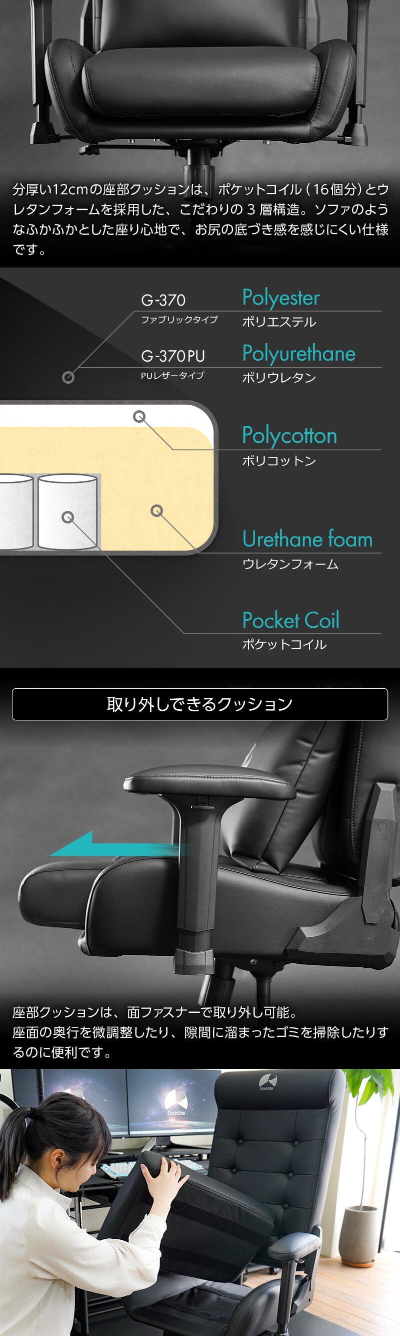 分厚い12cmの座部クッションは、ポケットコイル(16個分)とウレタンフォームを採用した、こだわりの3層構造。