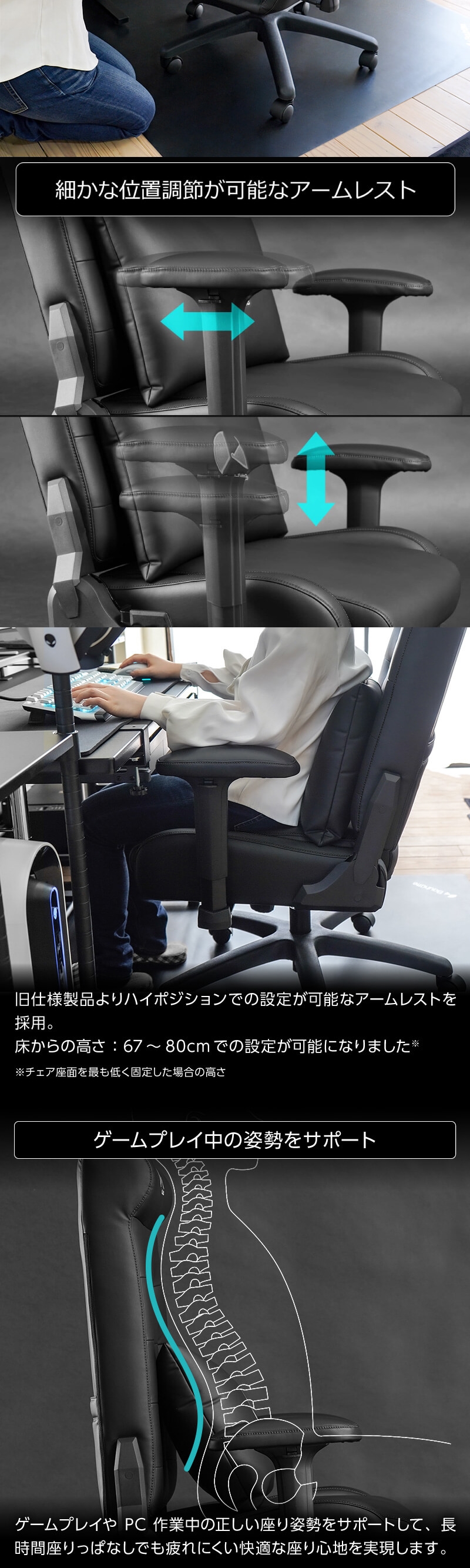 前モデルで課題だった「肘掛けの高さが足りない」問題を解決する、新アームレストを採用。